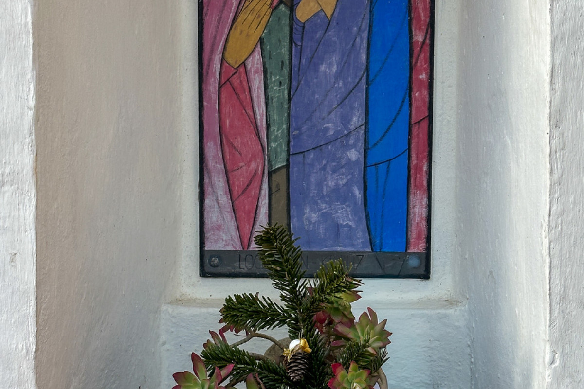 Das Museumsschloss hat Winterruhe, wir gehen daran vorbei und folgen den Schildern (Nr. 26, St. Peter) bis zum Kirchlein St. Peter ob Gratsch, einem kulturhistorischen Kleinod. Wir verlassen nun die asphaltierte Straße und fädeln zwischen den Leitplanken einen Steig ein, er führt im Zickzack steil, aber gut ausgebaut und teilweise grob gepflastert bergab, ein Geländer gibt Halt, Steintreppen entschärfen Steilstücke.