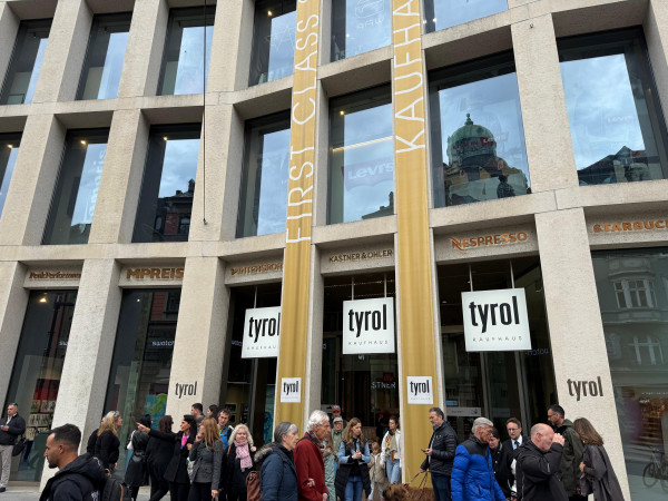Auf den Spuren des Geldes: Wie René Benkos Signa Holding Innsbruck verändert hat. Tour durch Innsbruck beim Journalismusfest in Innsbruck im vergangenen Jahr. Foto: SALTO/SNSie haben vor einem Jahr den Benko-Stadtrundgang in Innsbruck im Rahmen des Journalismusfests angeboten. Da haben viele mitgemacht …