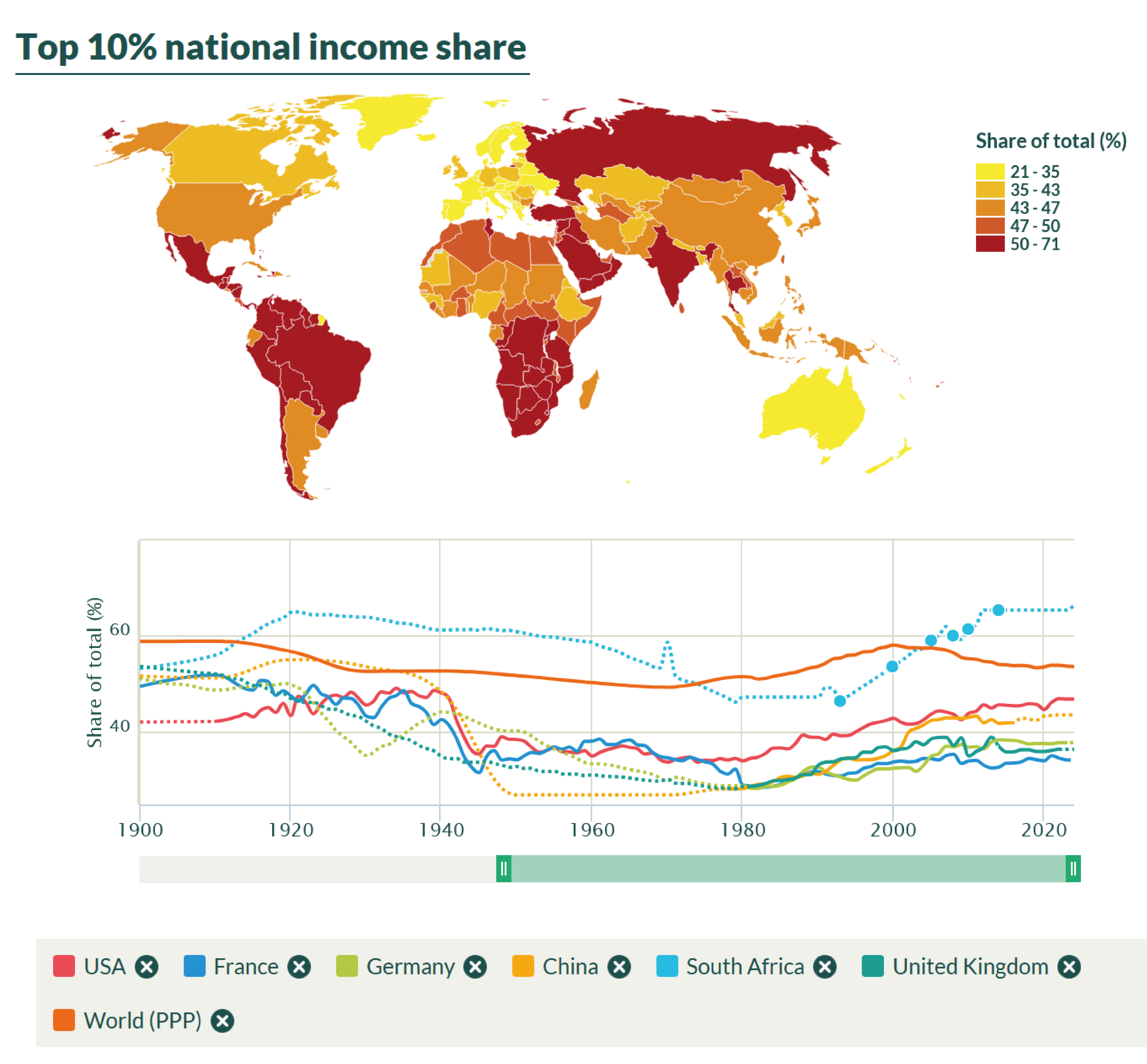 Verteilung von Vermögen: Nach einem Höchststand der Vermögenverteilung bei 10 % der Gesellschaften des Feudalismus und des aufsteigenden Bürgertums bis kurz vor dem Ersten Weltkrieg und einer breiteren Verteilung des Wohlstandes in der Nachkriegszeit konzentrieren sich die Vermögen seit den 1970er-Jahren wieder stärker in den Händen wirtschaftlicher Eliten. Foto: World Inequality Database/WID -