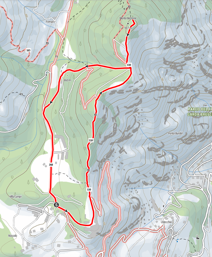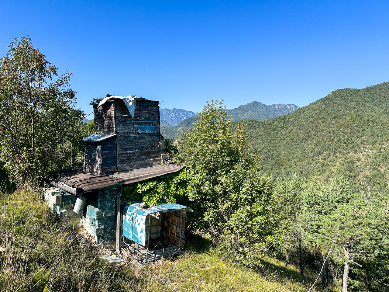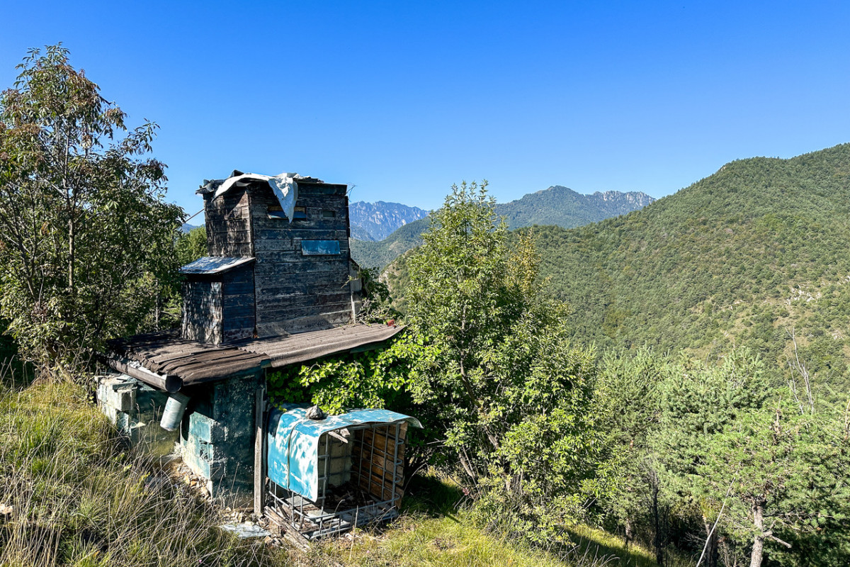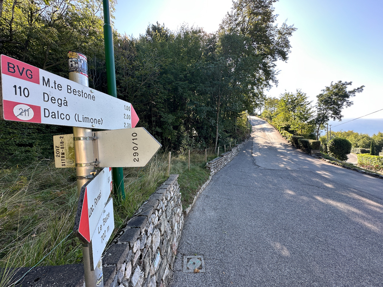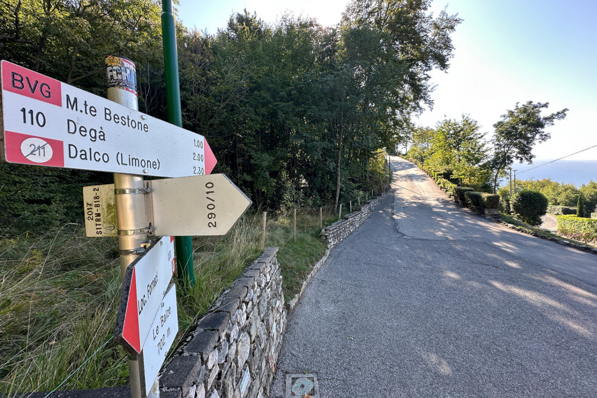 Wir starten in Voltino, einer der viele Fraktionen der Großgemeinde Tremosine. In den 80 er Jahre wurde dort eine Hotel- und Appartementsiedlung gebaut, welche den ganzen Bergrücken oberhalb von Voltino dominiert, eine der größten Bausünden am Gardasee, wenn man so will. Wir parken an der Dorfstraße, bei den Tennisplätzen neben der Pizzeria La Baita finden wir freie Parkplätze. Nach wenigen Gehminuten zweigt Weg Nr. 100 bergabwärts ab, die Gehzeit ist mit 1 Stunde angegeben. Wir sind ein Stück auf dem BVG Weitwanderweg (Bassa Via del Garda im Naturpark Parco Alto Garda bresciano) unterwegs. Es geht durch die Hotelsiedlung Le Balze und anschließend auf einem streckenweise etwas holprigen aussichtsreiche Kammwege, über eine Vorgipfel und letztendlich zum Gipfel mit einem Metallkreuz, einem Gipfelbuch und sogar einer Glocke, deren Gebimmel -jeder Gipfelbesucher läutet sie- uns von Weitem empfängt. Wir sind nicht allein unterwegs, die schöne Aussicht und der kurze Aufstieg locken viel Besucher an. Kurz unter dem Gipfel sind auf einer Wiesenlichtung die Hütten von Vogelfängern positioniert, obwohl der Fang von Singvögeln längst verboten sein sollte, zeugen die Fangstationen mit den Käfigen für die Lockvögel und den Hochständen der Jäger, dass es immer noch Unverbesserliche gibt, die dem Vogelfang frönen.