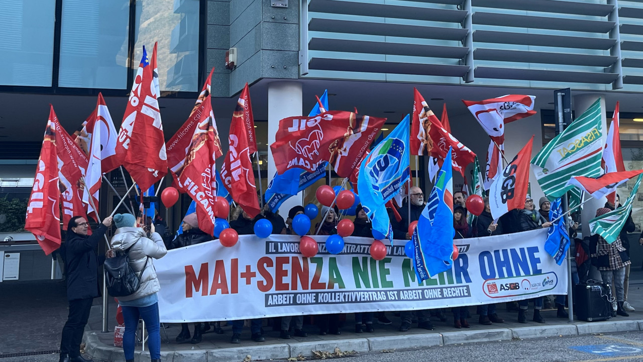 Aller guten Dinge sind drei. Nachdem die Gewerkschaften UILTuCS, FISASCAT, FILCAMS und SGB bereits zweimal demonstriert hatten, folgte nun die dritte und letzte Aktion vor dem geplanten Streik im Dienstleistungssektor am Freitag, dem 22. Dezember. Mit grünen und blauen Rauch-Bengalos und lauter Musik versammelten sich die Gewerkschaften vor dem HGV-Gebäude in der Bozner Schlachthofstraße und plädierten für eine Erhöhung der Löhne und Gehälter, um sie an die Inflation anzupassen und den hohen Lebenshaltungskosten in Südtirol entgegenzuwirken. „Wir sind heute hier, um eine Erneuerung des nationalen Tarifvertrags zu fordern“, erklärt UILTuCS Generalsekretär Stefano Picchetti. Ihm zufolge habe man sich das HGV-Gebäude als Protestort ausgesucht, da es sich beim HGV um den Arbeitgeberverband handle, der die nationale Ebene in Südtirol vertrete.