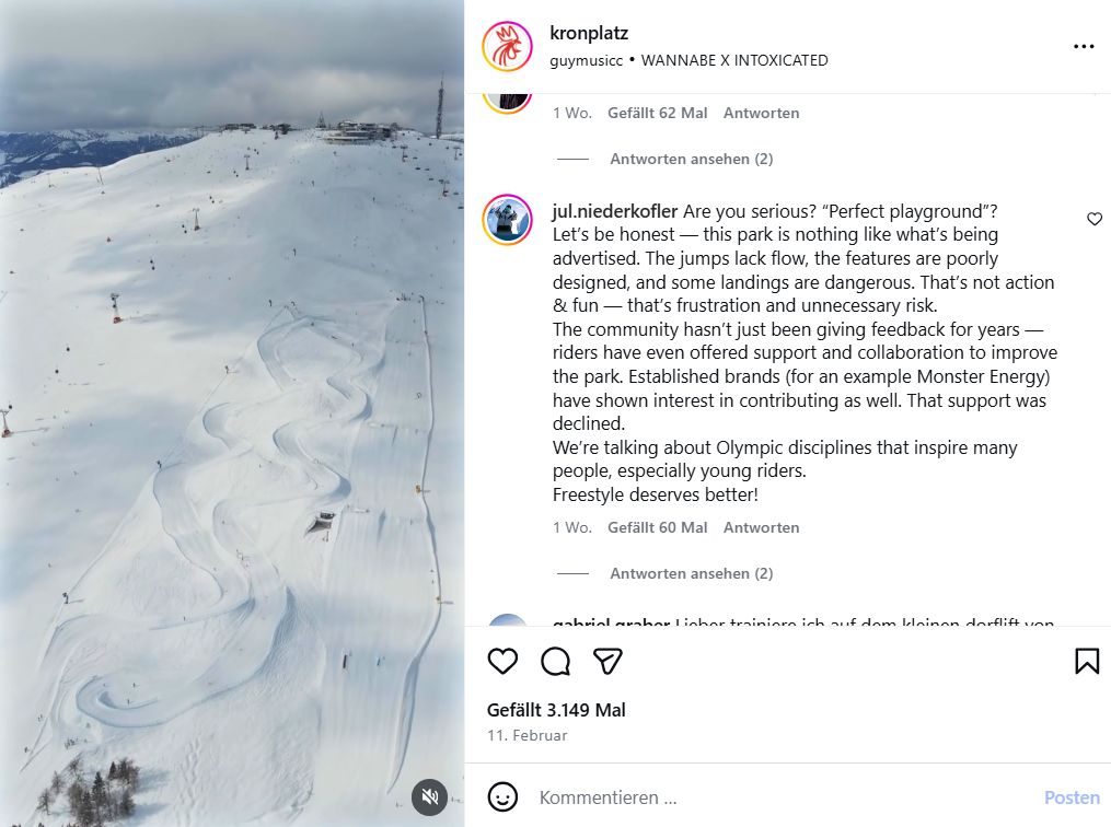 Der Kommentar des Snowboardlehrers Niederkofler unter dem Post jedoch blieb sachlich: „Seien wir ehrlich – dieser Park hat nichts mit dem zu tun, was beworben wird. Die Sprünge sind nicht flüssig, die Elemente sind schlecht konstruiert und einige Landungen sind gefährlich. Das ist keine Action und kein Spaß – das ist Frustration und unnötiges Risiko.“ Laut Niederkoflers Kommentar gebe die Community seit Jahren Feedback und habe sogar ihre Unterstützung angeboten, um den Park zu verbessern. Außerdem hätten etablierte Marken (zum Beispiel Monster Energy) ebenfalls Interesse an einer Beteiligung gezeigt, was allerdings abgelehnt wurde.
