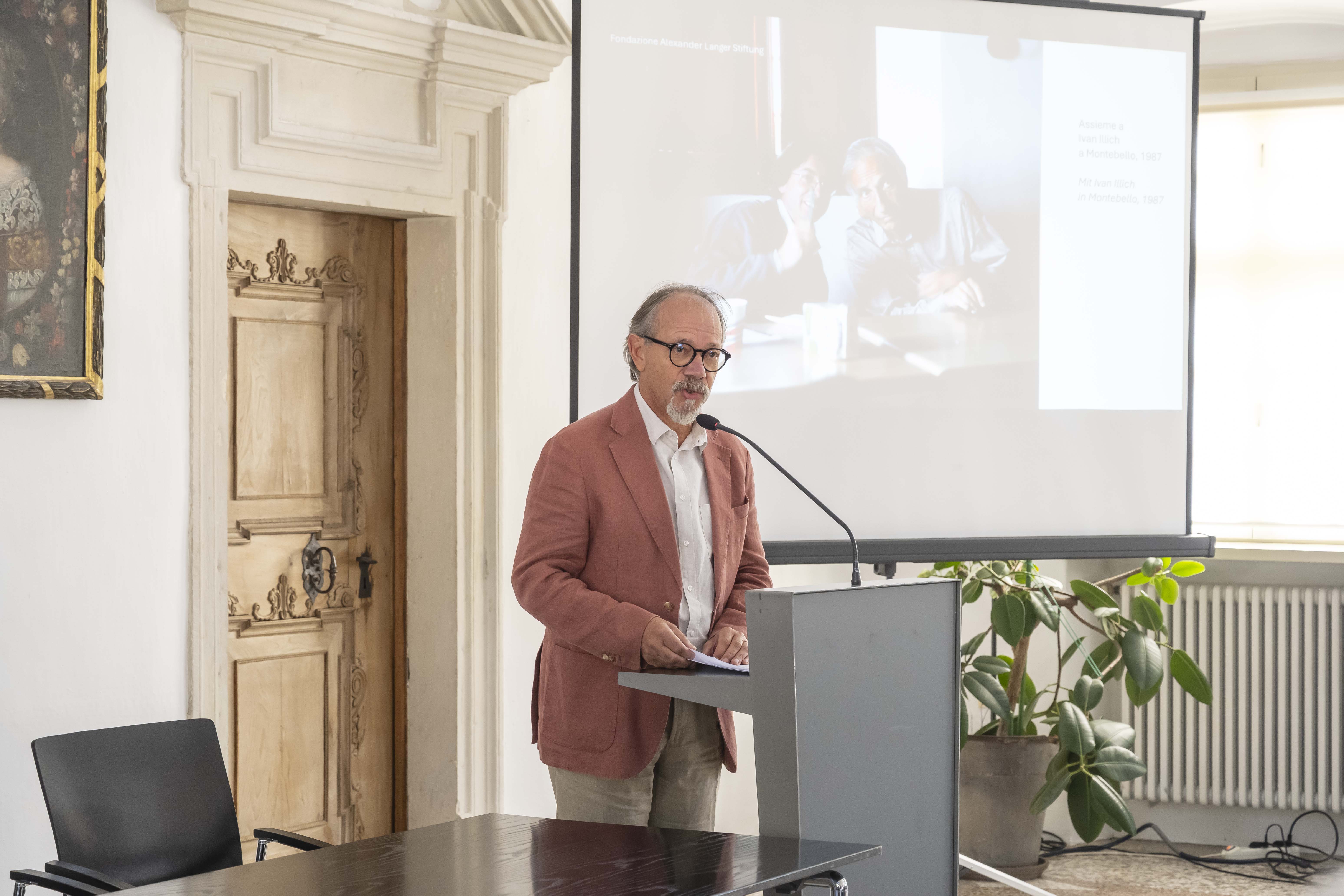 Giorgio Mezzalira: Il membro del direttivo della Fondazione, ha tracciato un breve profilo biografico dell’intellettuale ed esponente politico locale ed europeo, originario di Vipiteno, sottolineando alcune tappe fondamentali della sua vita, svoltasi principalmente tra Bolzano, Trento, Firenze e Bruxelles. Foto: SeehauserfotoLanger ha impostato la propria vita come una missione, vocata a mettere costantemente in gioco la propria umanità. Quell’essere umani che dovrebbe portare a fare ciò che è giusto e buono e affrontare la vita con impegno, autenticità e responsabilità. Tutti aspetti della forte tensione che connotava l’agire, anche politico, di Alex. Non una ricerca solitaria la sua, ma una sollecitazione a costruire ponti con gli altri, a impegnarsi nel cambiamento sociale. Essere uomini/donne è un mestiere difficile, esige responsabilità, impegno e rivolta contro l’ingiustizia. Langer vedeva l’agire umano come qualcosa che deve essere guidato non da ideologie rigide, ma da un’etica in grado di adattarsi alle situazioni e ai bisogni degli altri.