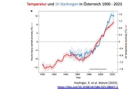 Nun hat sich der globale Klimawandel in den letzten Jahren schneller und stärker entwickelt, als man vor 30 Jahren noch erahnen konnte. Zudem ist ein Ende der doppelt so hohen Erwärmung in den Alpen nicht absehbar. Das bereitet zunehmend den Nährboden für (unter anderem auch) extreme Niederschlagsereignisse. Für Österreich gibt es eine Analyse, die zeigt, dass Extremniederschläge in den letzten 20 Jahren gegenüber dem Temperaturanstieg exponentiell zugenommen haben: