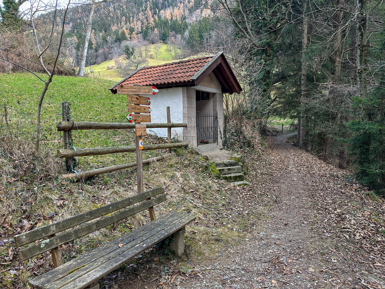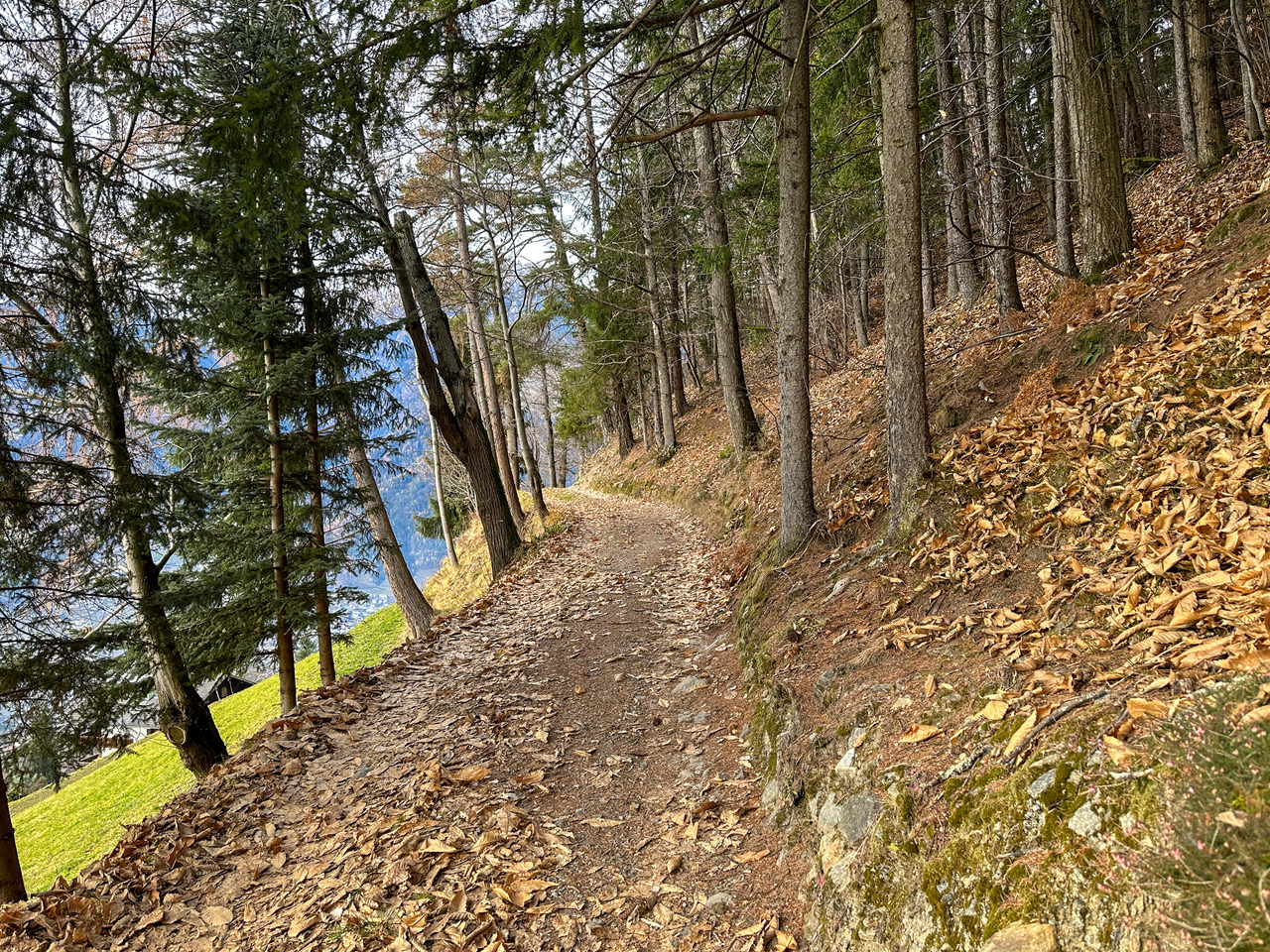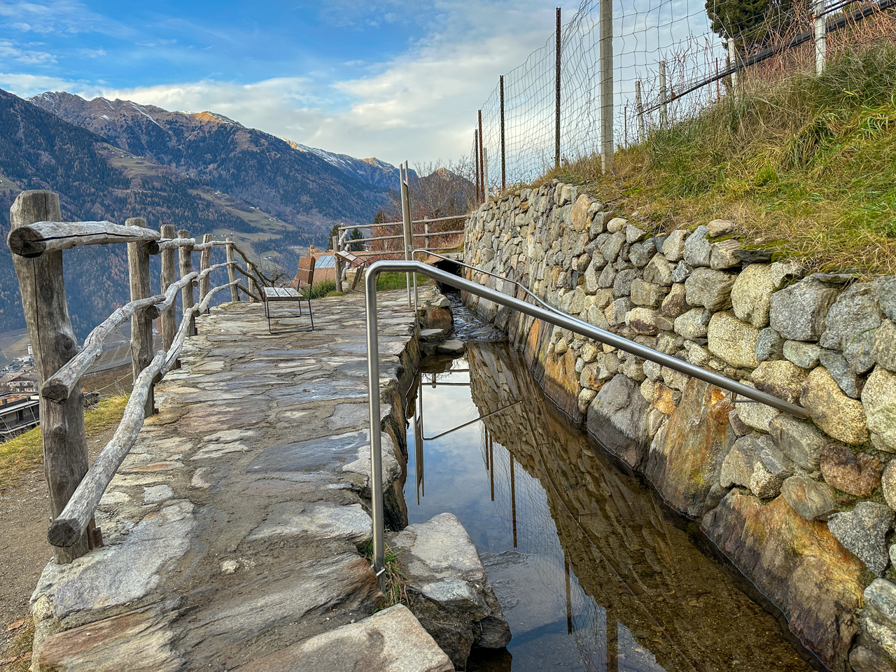 Ausgehend vom Naiftal geht es zu den Bergbauernhöfen oberhalb des Dorfes am sonnenexponierten Schennaberg bis zur Talstation der Taser-Seilbahn, der Rückweg folgt der Trasse des Waalweges, so ergibt sich eine schöne Wanderung, die auch im Spätherbst und schneearmen Wintern empfehlenswert ist. Nach einem kurzen, steilen Anstieg werden wir mit einer langen Hangquerung belohnt, die uns ohne größere Steigung bis zur Talstation der Taser-Seilbahn führt. Der Rückweg geht entlang eines Waalweges, -der um diese Jahreszeit kein Wasser führt-, sanft bis zum Ausgangspunkt zurück. Im Sommer sind diese Wege stark begangen, wir erkenne dies an der Vielzahl von Ruhebänken entlang der Strecke. Jetzt, außerhalb der Hochsaison, ist es ruhig, ja fast einsam. Nachteil: die meisten der Einkehrmöglichkeiten am Weg haben Winterruhe, am besten, wir packen eine Jause in den Rucksack!
