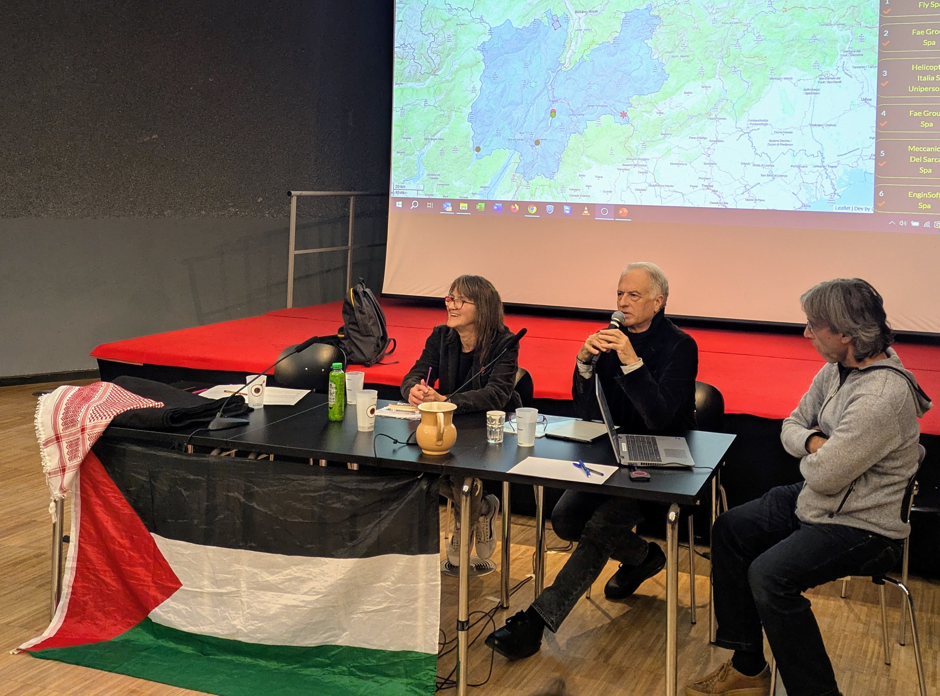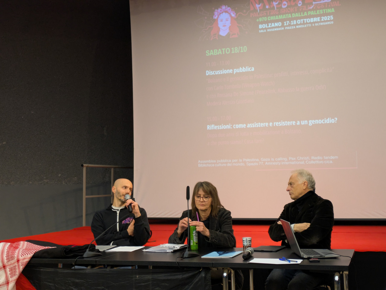 • “Quali strategie possiamo adottare sul nostro territorio contro il genocidio a Gaza e la corsa al riarmo? Una corsa che parte anche da qui – e non è solo uno slogan: l’Italia, compreso l’Alto Adige, è parte integrante di un sistema industriale che vive anche di guerra”, ha ricordato in apertura il moderatore Alessio Giordano, introducendo il confronto promosso sabato dal Nazra Short Film Festival nella sala Angela Nikoletti a Bolzano. L’incontro, incentrato su produzione, commercio e impatti umani del settore bellico, ha voluto mettere a fuoco la progressiva “normalizzazione” degli interessi militari dentro l’accademia, la ricerca e le politiche economico-industriali italiane.
