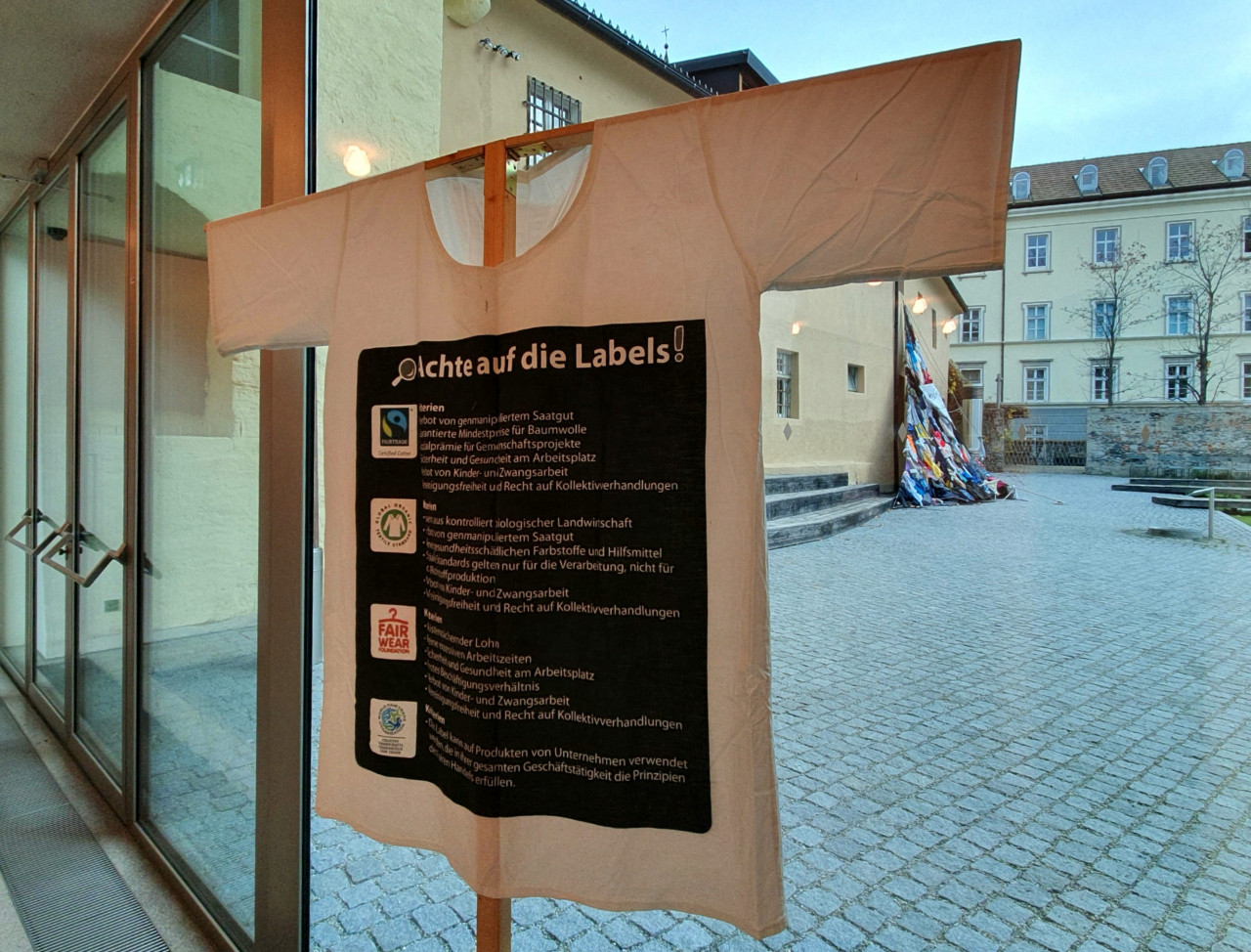 Proprio i lati oscuri dell’industria tessile sono al centro dalla mostra itinerante “Fashion Revolution-La produzione globale del tessile”, ideata e realizzata dall’OEW. Oltre all’imponente installazione, al piano terra della biblioteca, visitatori e visitatrici possono esplorare una serie di T-shirt giganti, che illustrano alcune caratteristiche delle catene produttive globali e ne sottolineano gli impatti ambientali e sociali. L’esposizione risponde a domande e curiosità legate, per esempio, alle ore di lavoro quotidiane di un operaio tessile in Bangladesh, ai luoghi in cui viene coltivato il cotone, a quali anelli della catena traggono i maggiori profitti e alle etichette a cui prestare attenzione quando si acquista un capo di abbigliamento.