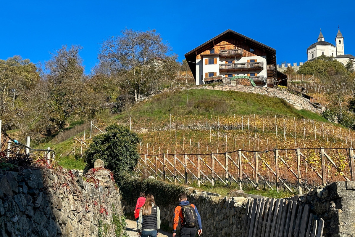 Dort zweigt ostwärts der Steig 1B ab, nach der Überquerung des Leitachbächleins führt er am Rand eines Weinberges bis zu einer asphaltierten Höfezufahrt, auf der wir nun bergab (Nr. 3) wandern. In einer Kehre, bei einem Wegkreuz, biegen wir zum Hienghof ab, einem der bekannten Törggelehöfe in Leitach. Wer etwas Abenteuer liebt, geht am Hofe vorbei bergab durch Weinberge, der Steig 3A geht heftig steil durch die Reben talwärts, auf diesem Steilstück sind sogar Seile als Handlauf gespannt, nach Niederschlägen kann das sehr hilfreich sein. Dann taucht der Steig in den Buschwald ein und führt im Zickzack im Tal des Leitachbächleins zur Staatsstraße und zum Parkplatz beim Schwimmbad.