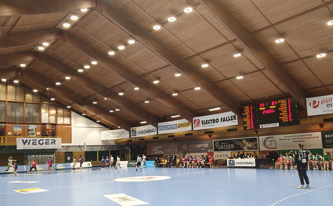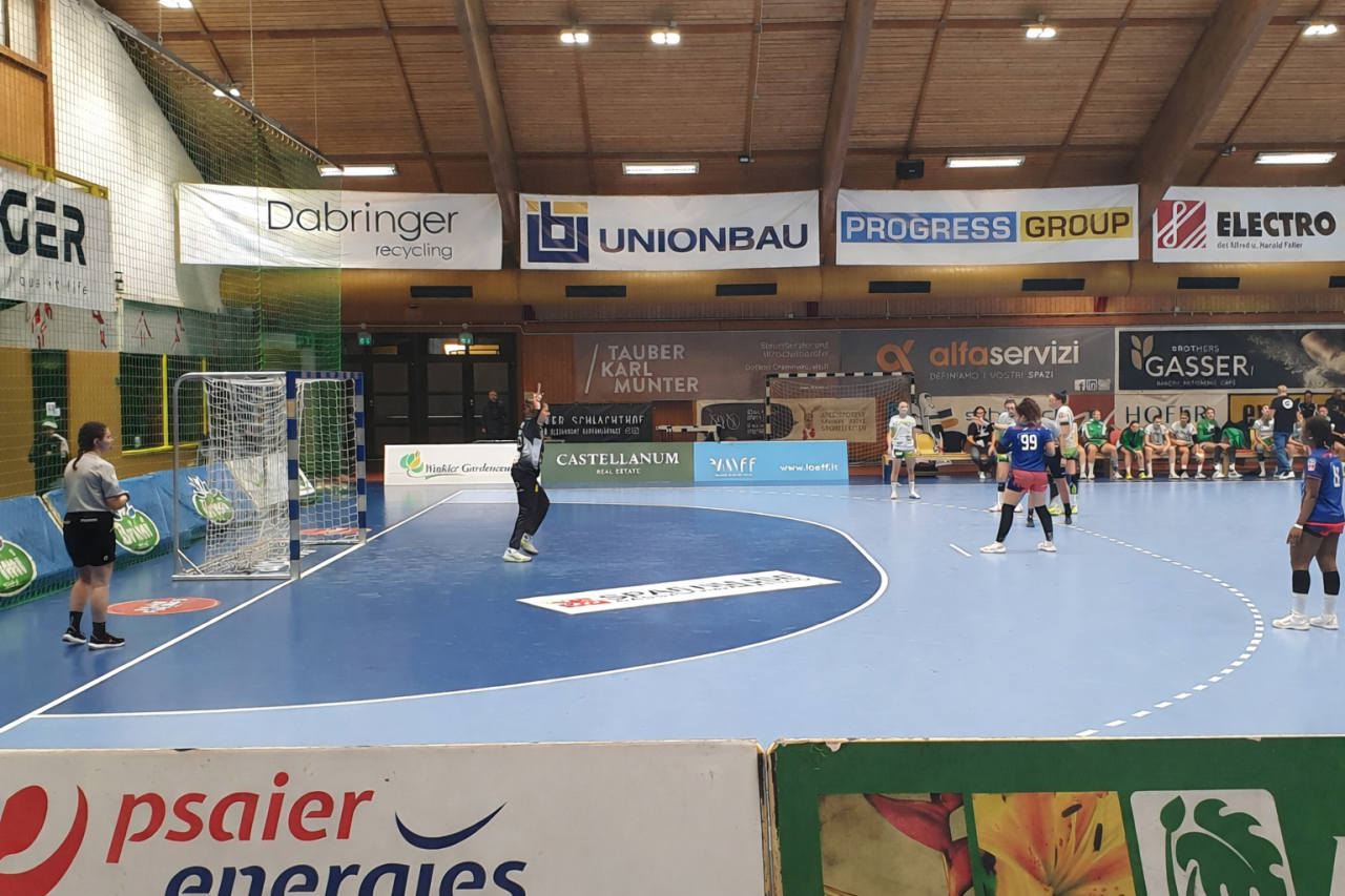 Quando inizia il riscaldamento, Francesca Luchin, portiera dell’SSV Handball Brixen, cammina concentrata lungo la linea laterale del campo. Mentre si applica il tape sulle dita, ripassa mentalmente le strategie offensive e le soluzioni di tiro delle giocatrici del Cellini Padova, l’avversario di stasera. Poi raggiunge le sue compagne per la corsa e gli esercizi di squadra. Intanto sugli spalti i tifosi acclamano le biancoverdi guidate da Hubi Nōssing, accompagnando il ritmo dei loro applausi con il suono di due tamburi. Dopo l’appello della direttrice di gara è il momento di scendere in campo. Con il numero 26 sulle spalle Francesca Luchin prende posto tra i pali.