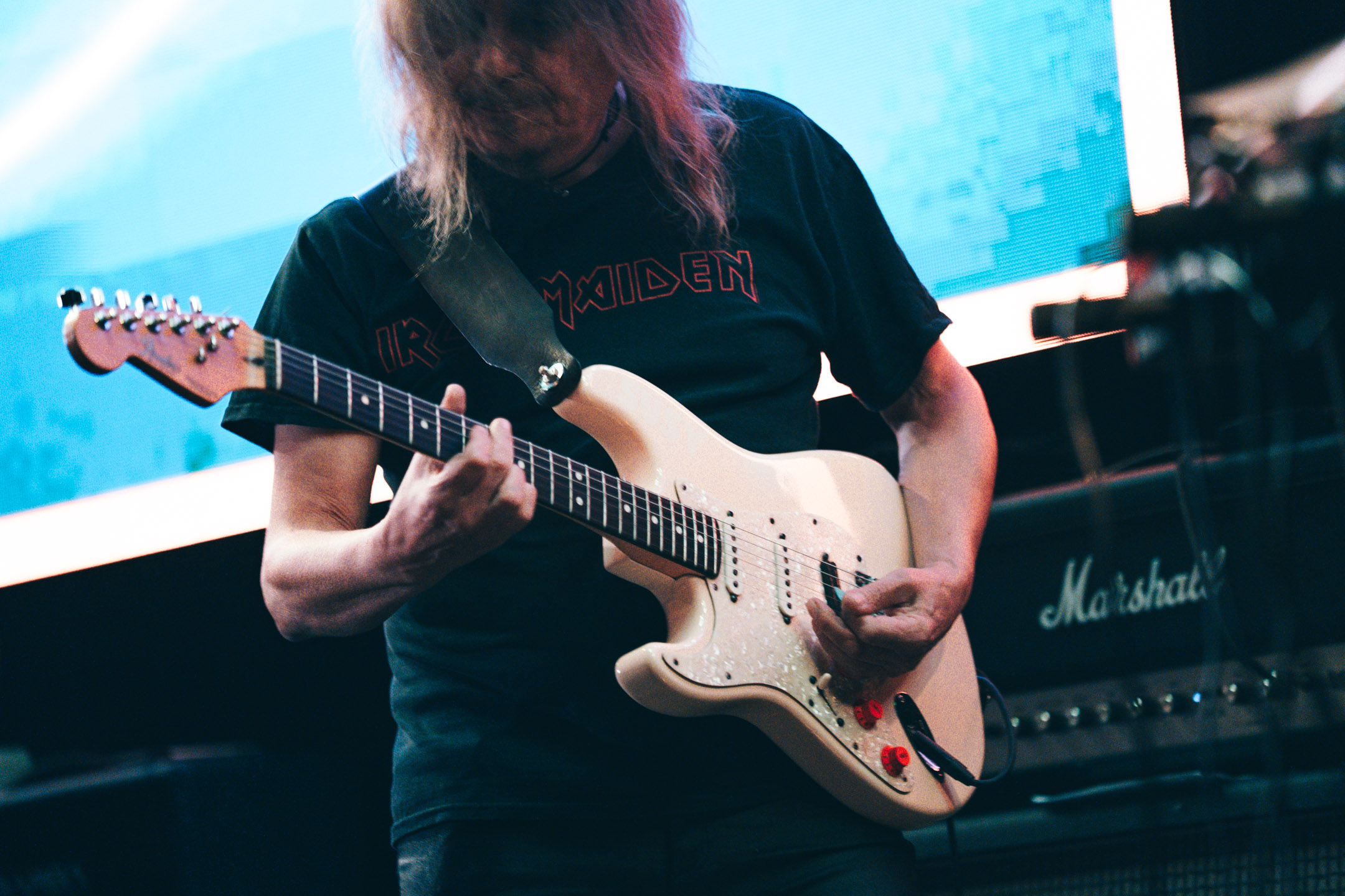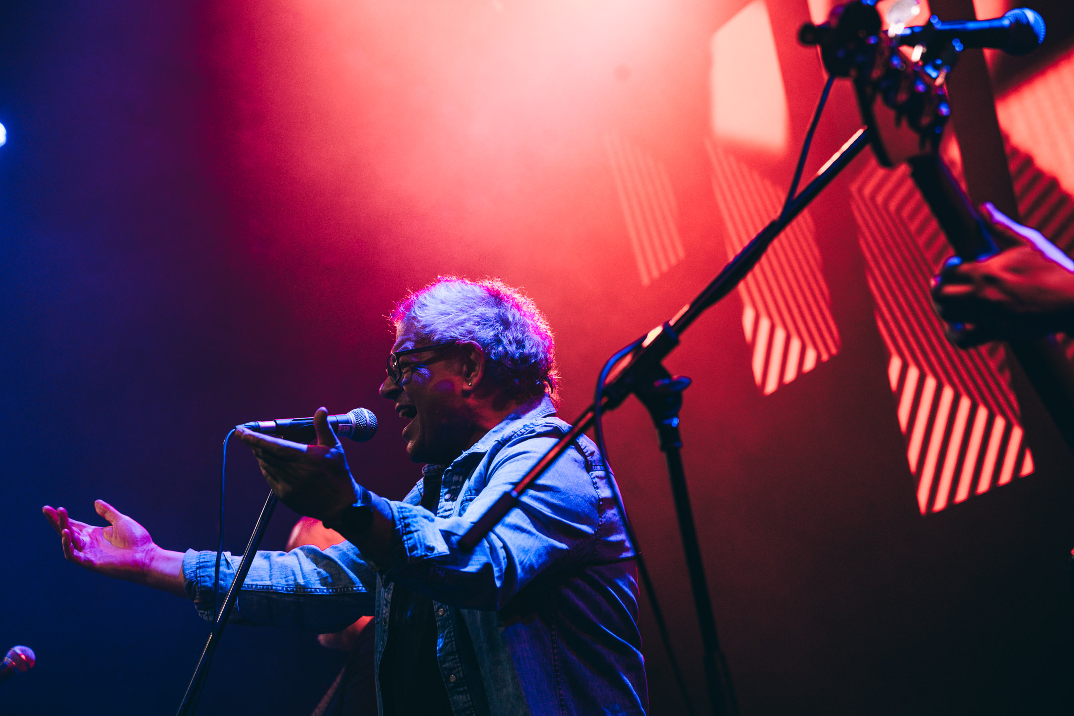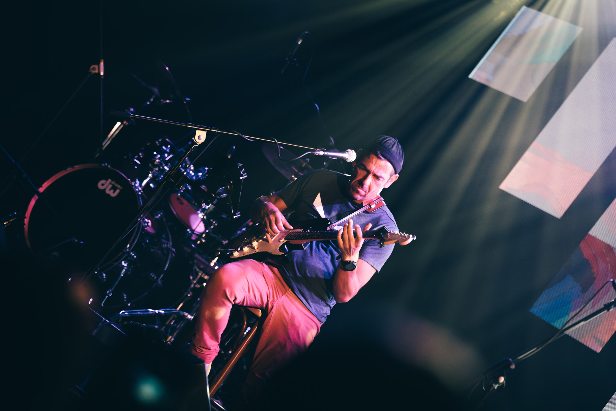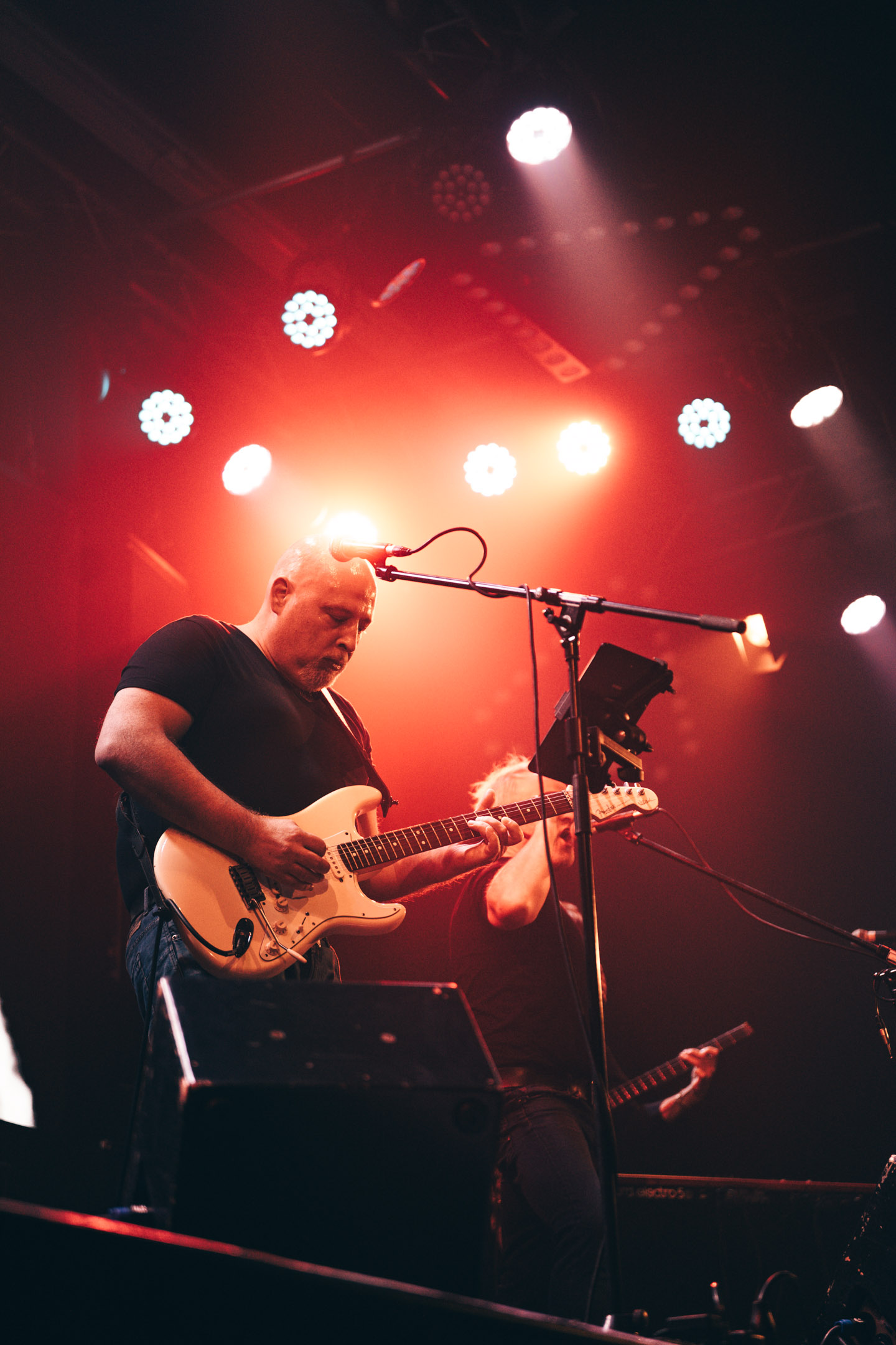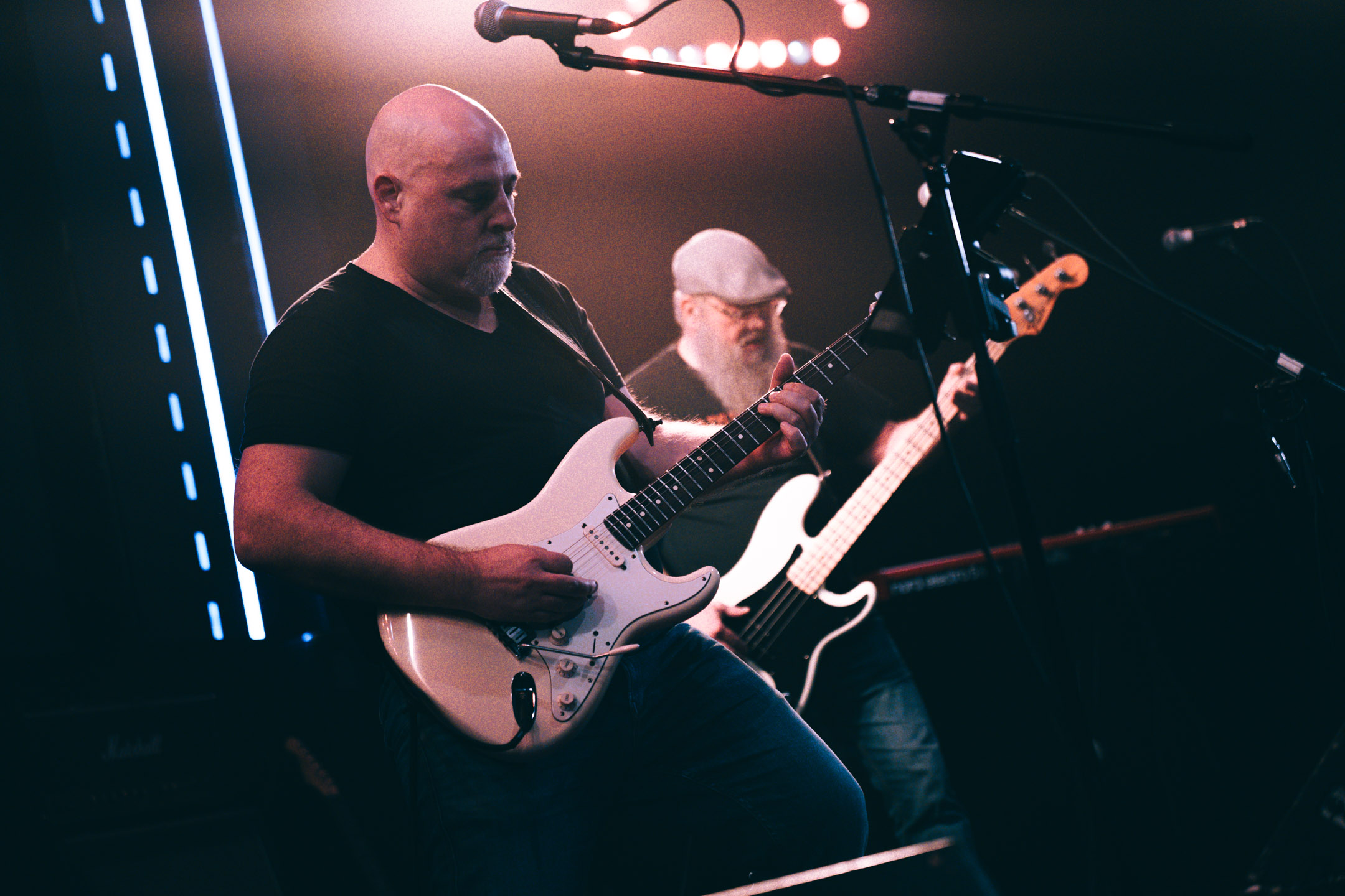 Die Formationen wechselten völlig problemlos im Laufe des gesamten Abends und alte Wegbegleiter und Freunde von Poldo trafen sich für einen Song oder zwei, auf der Bühne (v.l.n.r.): Andreas Ladurner (Gitarre), Pippo Filippin (Gitarre, Bildmitte ganz hinten), Giuseppe Gasperi (Gitarre und Stimme), Tontechniker und Teil der Cover-Band Fonzies, Peppino Adamo (Bass) und Umberto „Umba“ Bertolani (Keyboards). Foto: Julia von Wenzl -