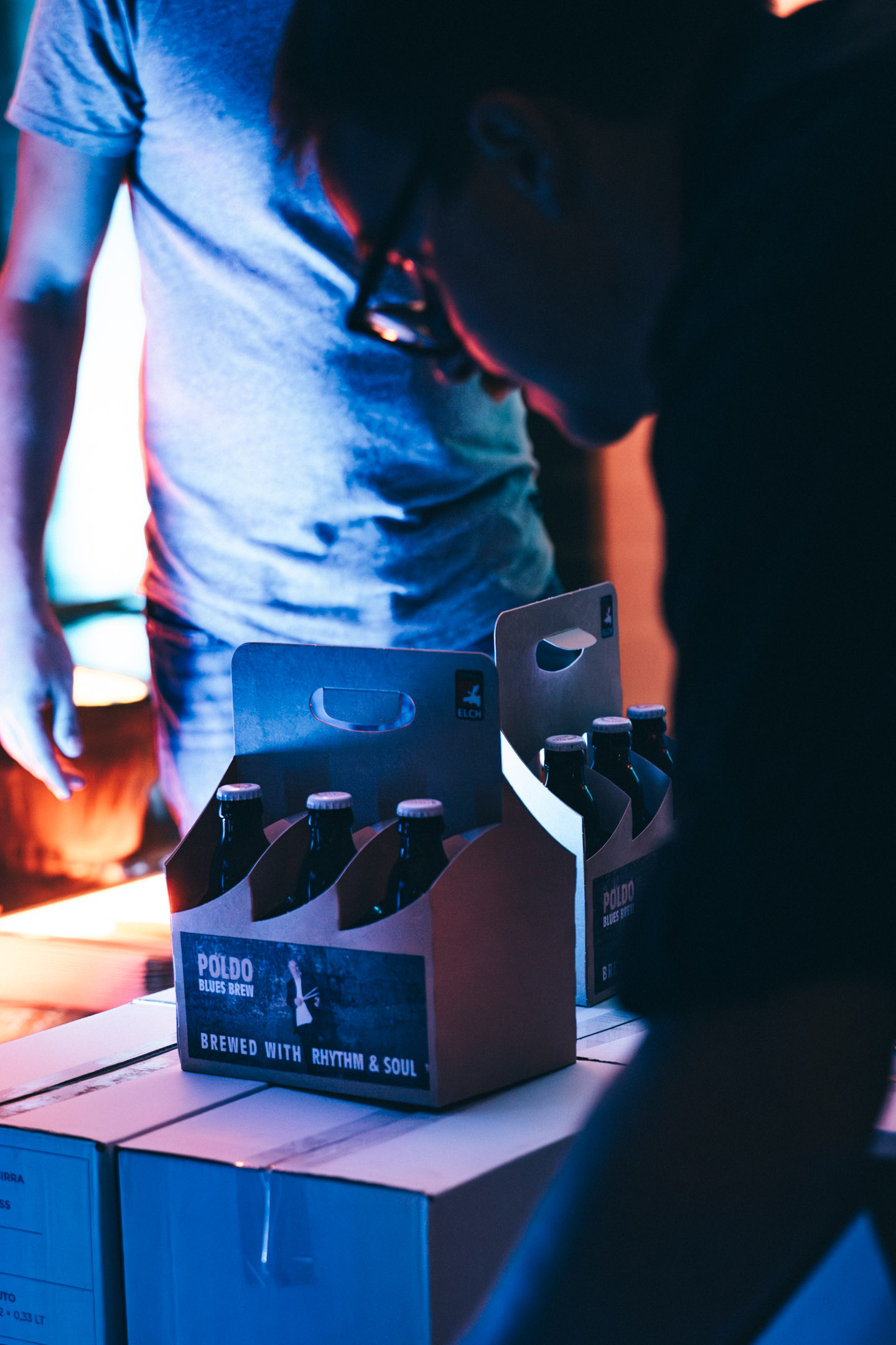 Armin Gatterer, mit Poldo in der Band Blues Project, hat für den Abend mittels seiner Brauerei „Latemar Bier“ aus Welschnofen, eine „Special Edition“ für Poldo abgefüllt: Im Bild zu sehen übrigens Thomas Pircher, einer der Hauptorganisatoren des Abends, der ständig mit Koordinierungsaufgaben beschäftigt war. Foto: Julia von Wenzl -