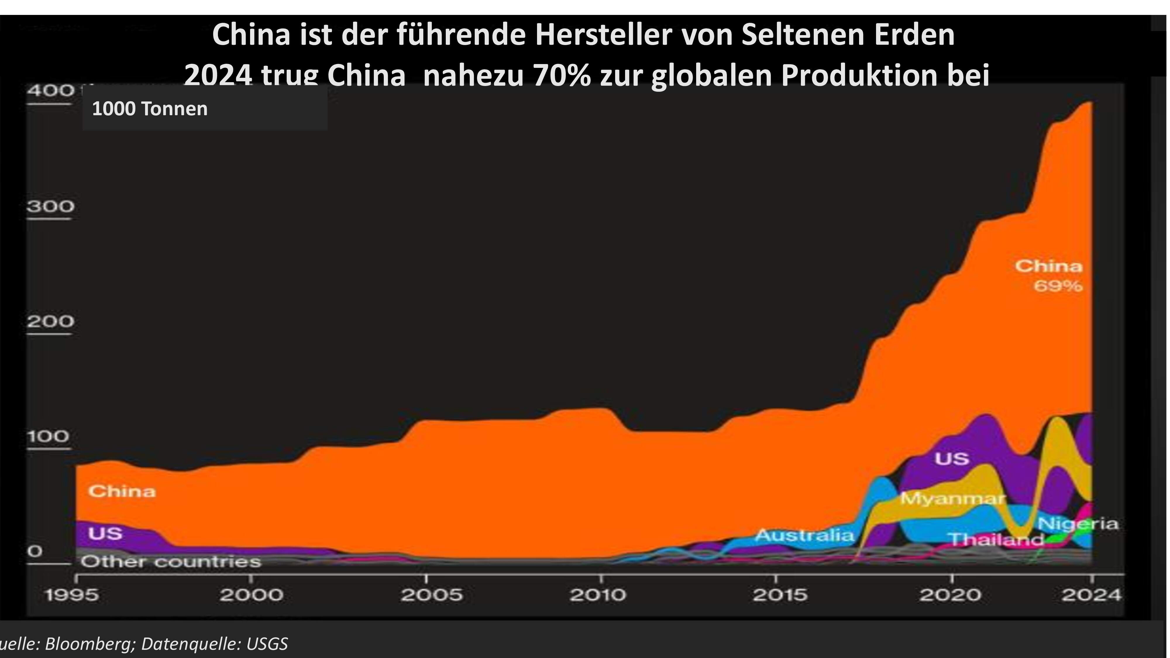 "Für China sind Seltene Erden das, was Öl für Saudi-Arabien ist", soll Deng Xiaoping, ehemaliger Machthaber Chinas 3/, schon in den 1990er Jahren gesagt haben. Dies ist ein Beispiel dafür, dass China Strategien mit langem Zeithorizont verfolgt. Fakt ist, dass China den weltweiten Markt für Seltene Erden beherrscht. Weit über zwei Drittel der begehrten Metalle werden derzeit in China abgebaut, die größten Vorkommen liegen in China und zwar in der inneren Mongolei. China hat durch erhebliche staatliche Investitionen ein umfassendes Netzwerk zur Veredelung der gewonnenen Rohmaterialien geschaffen und verfügt derzeit über fast 90% der weltweiten Verarbeitungs-Kapazitäten. Der Abbau von Seltenen Erden in China erfolgt oft in großem Maßstab, was es China ermöglicht, die Produktionskosten zu senken. Die Fähigkeit, sowohl Rohstoffe abzubauen als sie auch zu verarbeiten, gibt China einen zusätzlichen Vorteil auf dem Markt.