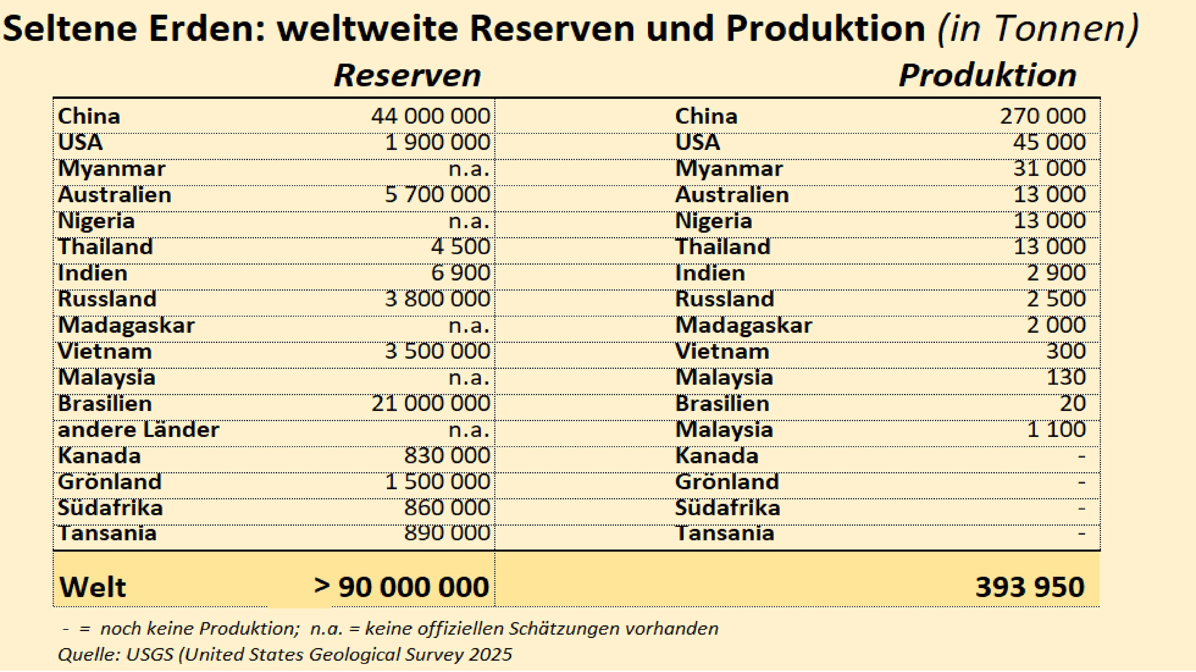 Die USA versuchen die bereits bestehenden Produktionsstätten von Seltenen Erden im eigenen Land zu erweitern und neue aufzubauen. Zudem wurde heuer von der Trump-Administration ein Rohstoffabkommen mit der Ukraine abgeschlossen, unter anderem auch, weil die Ukraine beträchtliche Vorkommen von Seltenen Erden haben soll. Präsident Trumps Interesse an Grönland ist nicht nur geostrategischer Natur, sondern es geht auch um wertvolle Rohstoffe, wie z. B. um Seltene Erden, die in Zukunft in Grönland abgebaut werden könnten. Die Regierung Trump setzt zunehmend auf aggressive Maßnahmen, um den Zugang zu wichtigen Rohstoffen, wie z.B. zu Seltenen Erden, im Ausland zu sichern 4/.