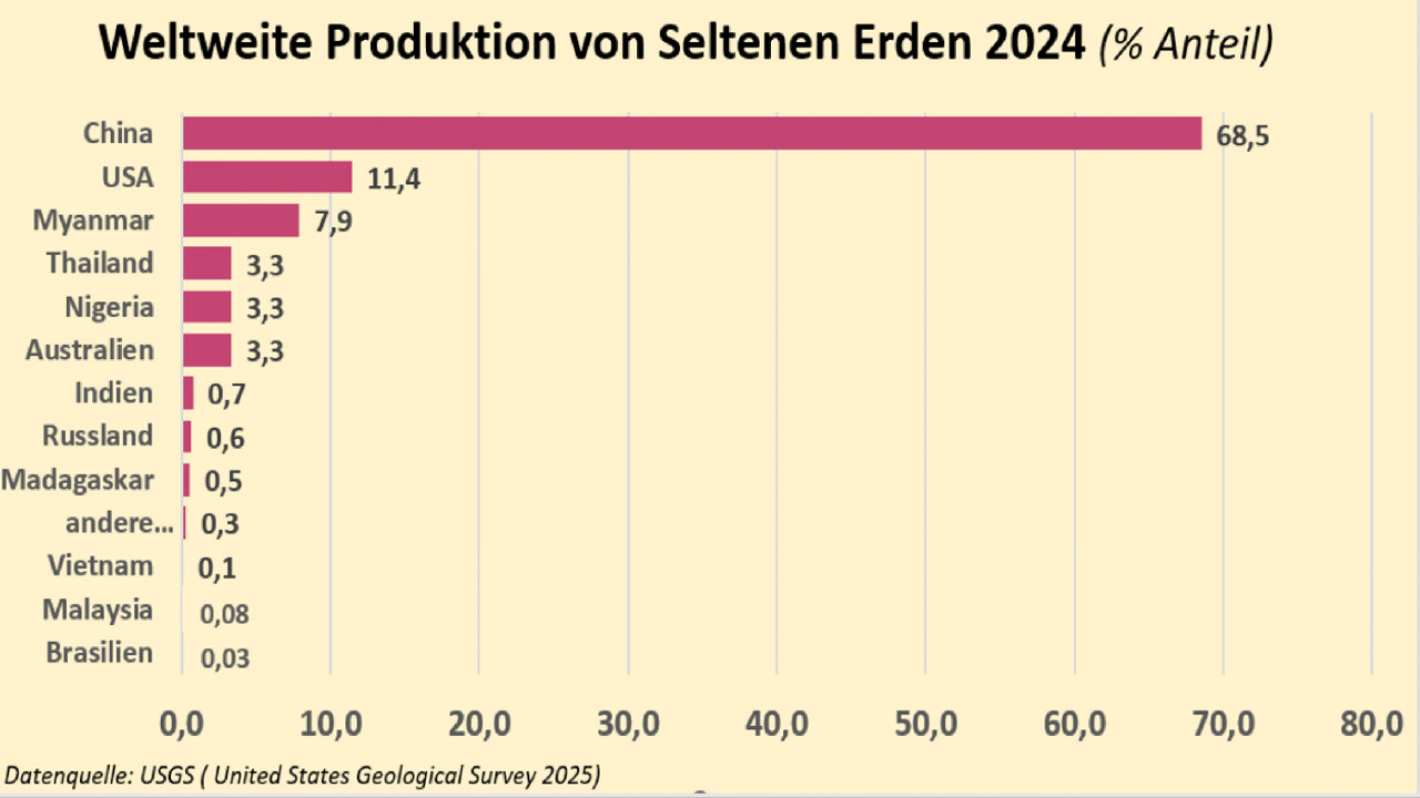 Mit fast 70% produziert China weit über zwei Drittel der Seltenen Erden, an zweiter Stelle rangieren die USA mit etwas über 11 % und Myanmar mit fast 8%. Thailand, Nigeria und Australien haben je einem Anteil von 3,3 % an der weltweiten Produktion. Alle übrigen Produzenten kommen nur auf einen sehr geringen Teil von unter 1%.