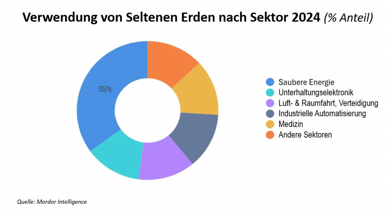 Seltene Erden spielen aufgrund ihrer einzigartigen physikalischen und chemischen Eigenschaften eine zentrale Rolle in vielen Schlüsseltechnologien. Besonders in der Hightech-Industrie sind sie unverzichtbar. Ihre vielseitigen Einsatzmöglichkeiten machen sie zu einem essenziellen Bestandteil vieler Bereiche der modernen Wirtschaft. Seltene Erden spielen eine zentrale Rolle bei der Herstellung von modernen Halbleitern. Sie finden Verwendung in Bereich der Sauberen/Erneuerbaren Energien (z.B. in Windkraftanlagen und im E-Auto-Sektor) in der Elektronik (in Displays, in Akkus, in Lautsprechern, in Smartphones, in Computern und in leistungsstarken Magneten), in der Luft- und Raumfahrt sowie in der Rüstungsindustrie (bei der Herstellung von Drohnen, Raketen, in der Laser- und Satellitentechnik). Auch in der Medizin-Technik werden Seltene Erden verwendet (z.B. in bildgebenden Verfahren, wie MRTs)