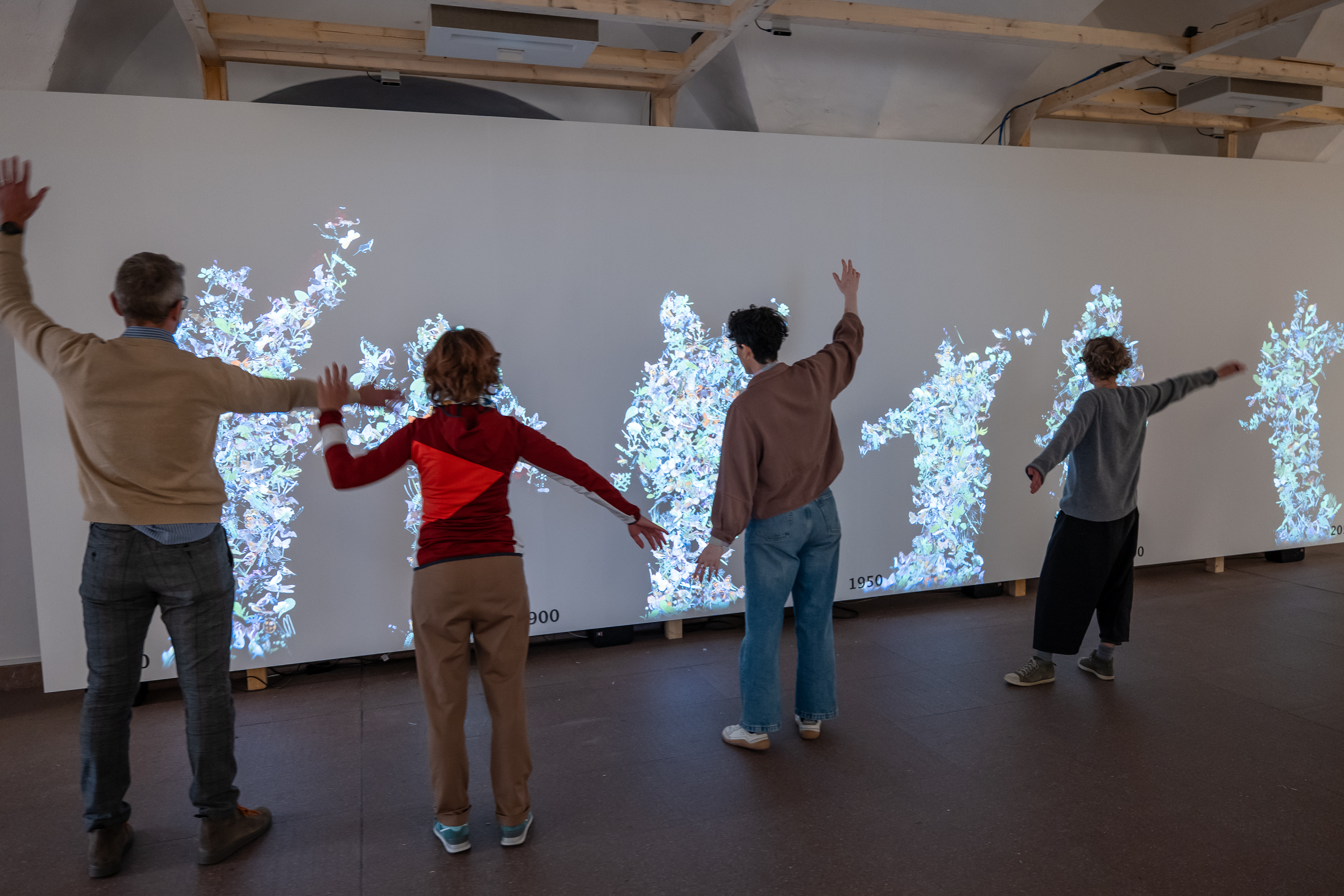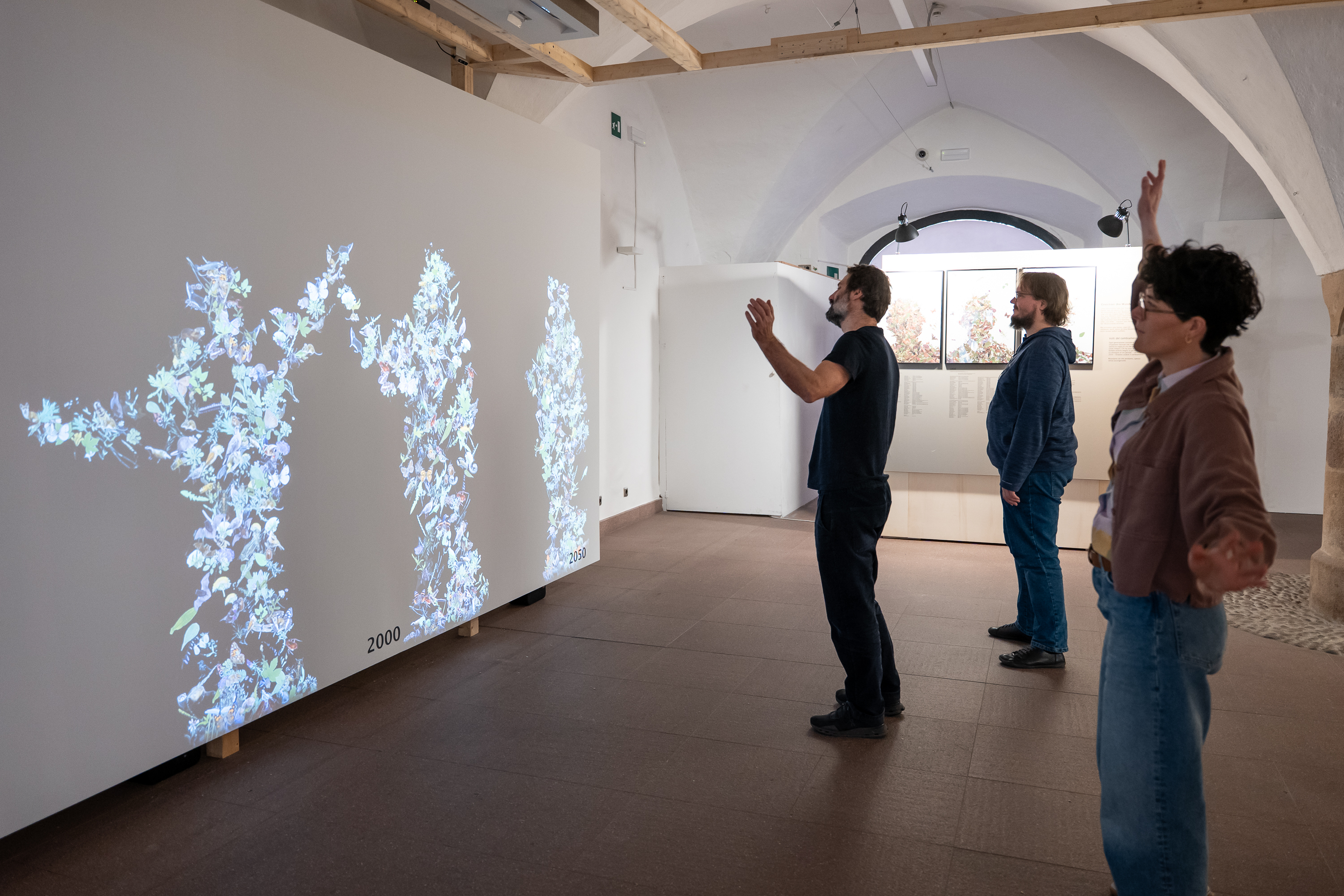 Allora, nella mostra ci sono delle parti interattive e ci sono delle parti analogiche. La mostra è composta da cinque isole. La prima è un’installazione interattiva, dove le persone possono interagire fisicamente con una piccola selezione dei dati dell’archivio. In questa installazione le persone vedono la propria sagoma composta da animali e piante e come questi animali e queste piante cambiano nel tempo, dal 1850 fino al 2050. Poi c’è una seconda isola dove le persone vedono tre ritratti dal 1850, 1950 e 2050, tramite i quali le persone possono esplorare in una maniera più dettagliata quello che hanno già visto nella sagoma. Ma questa volta le piante e gli animali sono presenti anche come elenco scritto; quindi, viene dato più risalto ai dati. Le prossime due isole invece fanno vedere come che il cambiamento nella biodiversità non significa solo perdere specie, ma anche che gli ecosistemi perdono complessità e varietà che cambio di biodiversità significa anche che ci sono nuove specie che arrivano da noi e sostituiscono altre. L’’ultima isola racconta le specie che si sono estinte, usando come esempio una pianta acquatica che abbiamo diciamo ricreato con l’aiuto dell’intelligenza artificiale e stampato con una stampante 3D. E l’ultima parte interattiva della mostra è analogica: invitiamo le persone che visitano la mostra a inviare una cartolina a sé stesse nel futuro.