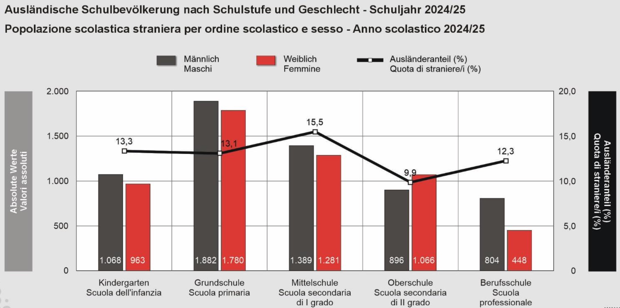Die Verteilung ist sprachlich unterschiedlich: In Einrichtungen mit italienischer Unterrichtssprache liegt der Anteil deutlich höher. In italienischen Kindergärten besitzen 23,3 Prozent der Kinder keine italienische Staatsbürgerschaft, in italienischen Grund- und Mittelschulen 25,1 beziehungsweise 29,8 Prozent. In deutschsprachigen Einrichtungen liegt der Anteil bei rund zehn Prozent, in ladinischen Tälern bei knapp sieben Prozent.