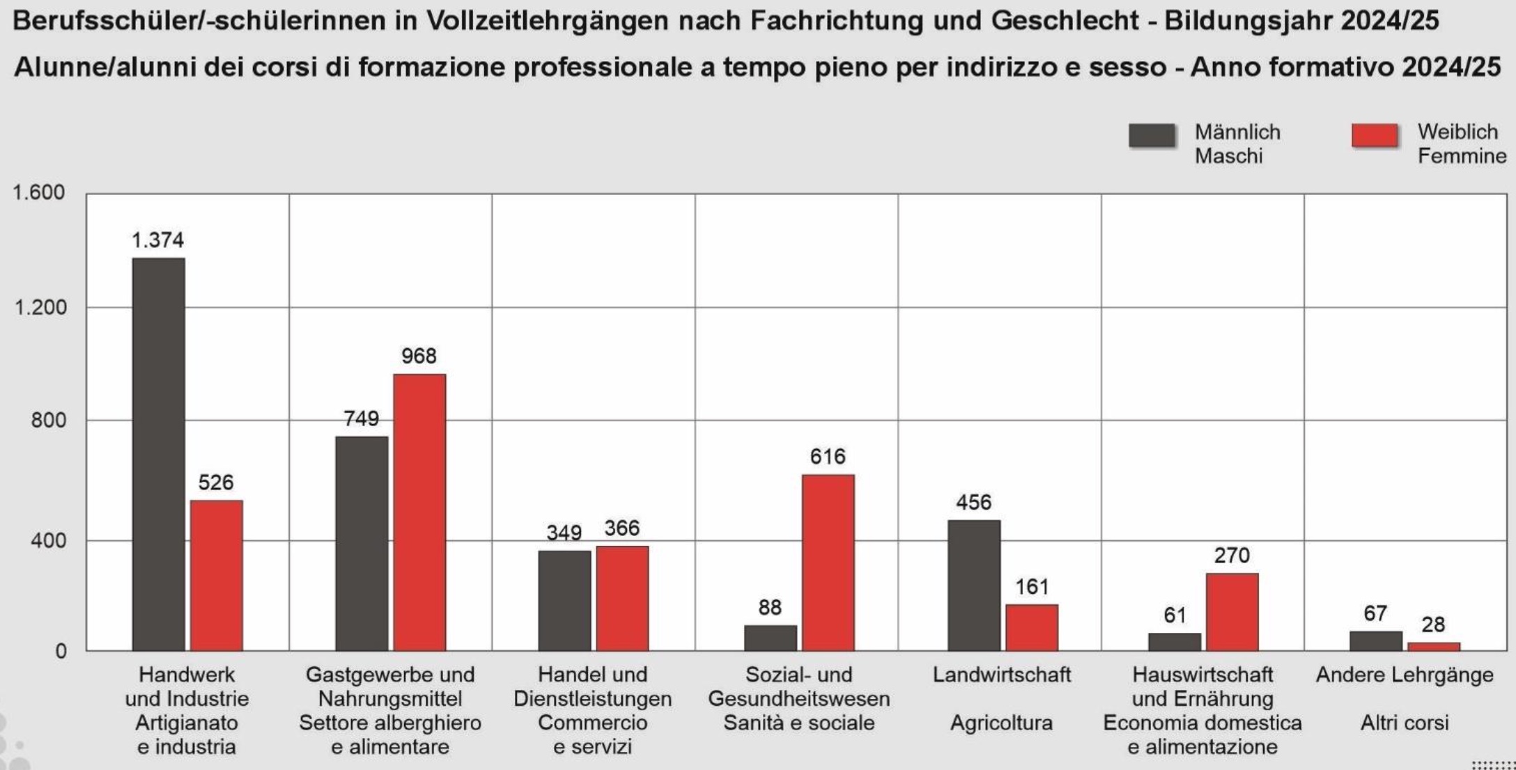 Ähnliche Muster zeigen sich in den Berufsschulen: Vollzeitlehrgänge in Handwerk, Industrie und Landwirtschaft werden häufiger von männlichen Jugendlichen gewählt, während junge Frauen stärker in den Bereichen Gastgewerbe, Sozial- und Gesundheitswesen sowie Hauswirtschaft vertreten sind.