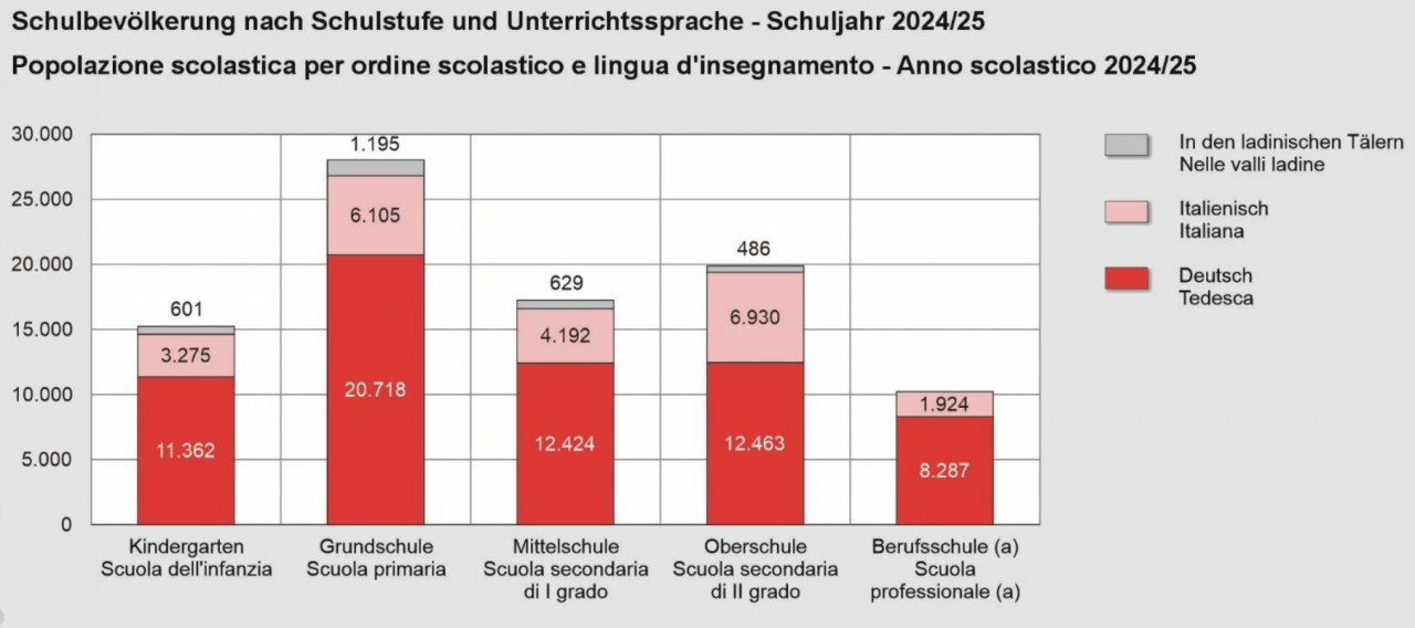 Im vergangenen Bildungsjahr besuchten 15.238 Kinder einen Kindergarten, 28.018 die Grundschule und 17.245 die Mittelschule. In den Oberschulen waren 19.879 Jugendliche eingeschrieben, weitere 10.211 absolvieren eine Ausbildung an einer Berufsschule. 72 Prozent der Kindergartenkinder und Schülerinnen und Schüler besuchen deutsche Einrichtungen, 24,8 Prozent italienische und 3,2 Prozent besuchen Kindergärten und Schulen in ladinischen Ortschaften. Keine ungewöhlichen Zahlen in Bezug auf die sprachliche Verteilung in unserem Bildungswesen.