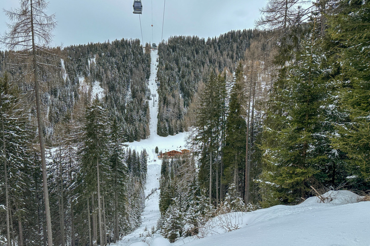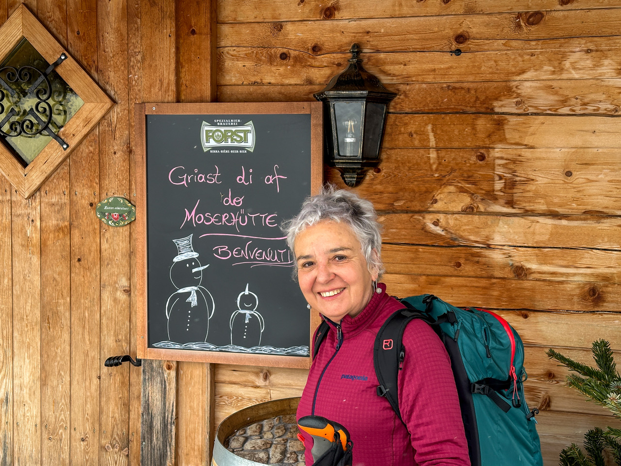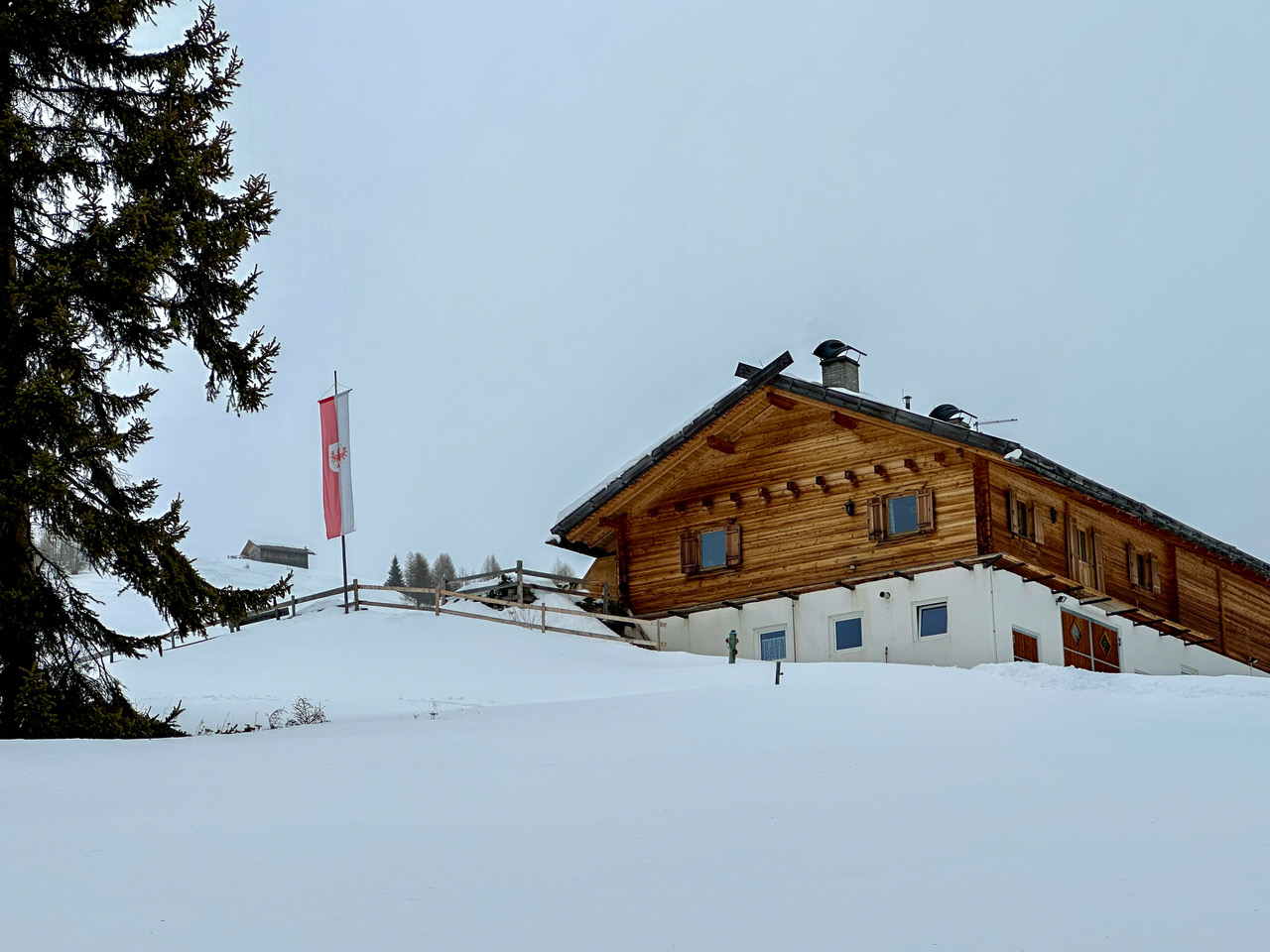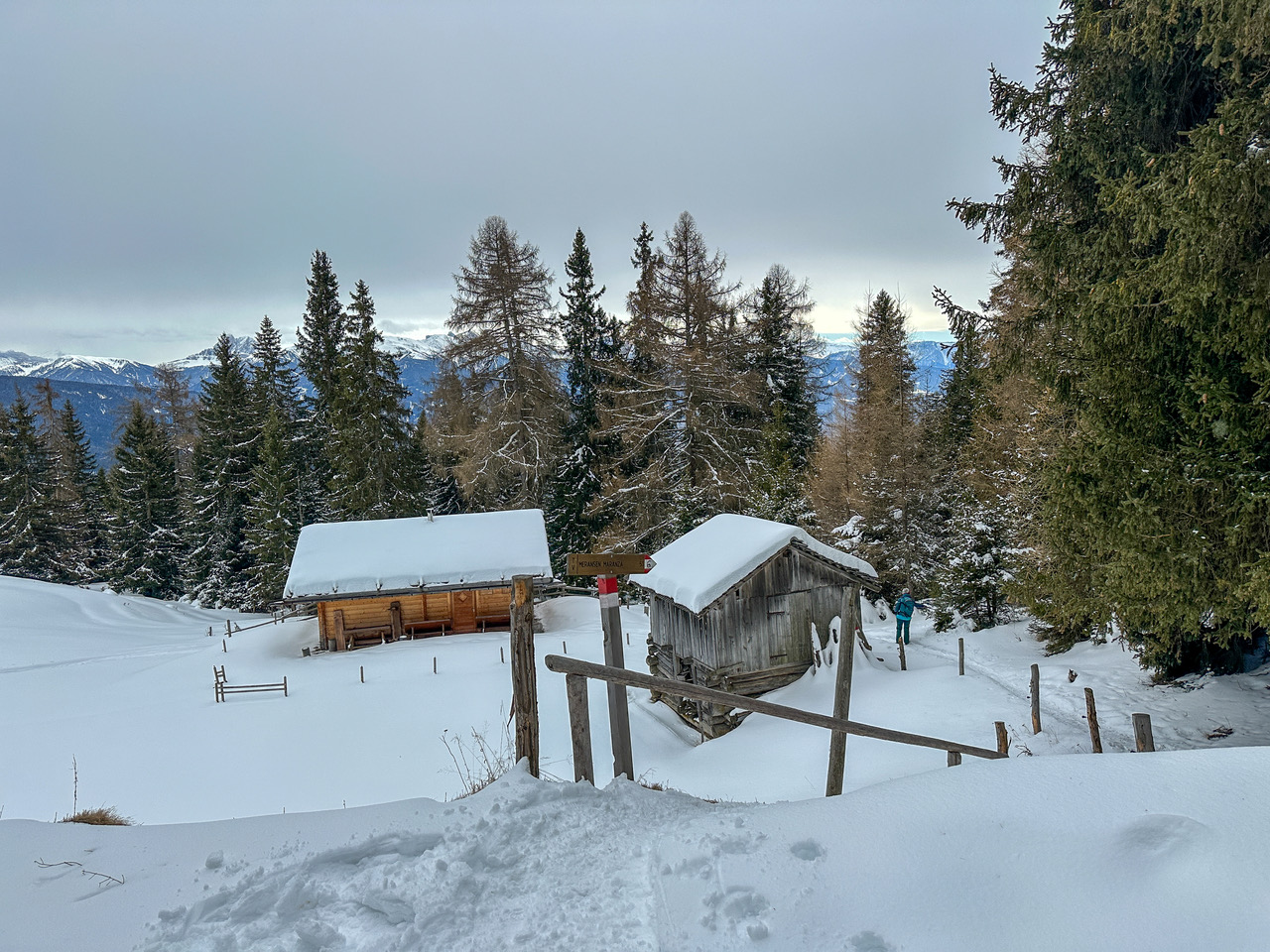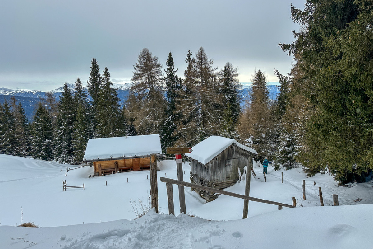 Hoch über Mühlbach am Eingang zum Pustertal liegt auf einem weiten Wiesenbalkon Meransen. Im Rücken des Dorfes erheben sich zwei Bergkuppen, der dominierende Gitschberg (2.510 m) und westlich davon der etwas niedere Kleine Gitsch oder Kleingitsch (2.262 m) mit der Moser Hütte. Zu der wollen wir hin, sie ist im Winter geöffnet und auf guten gespurten Wegen leicht zu erreichen. Leider war es an diesem Tag etwas bewölkt, aber es wehte kein Wind, in der Nacht hatte es etwas geschneit, die Wege waren aber bereits gespurt: insgesamt also gute Wanderbedingungen.