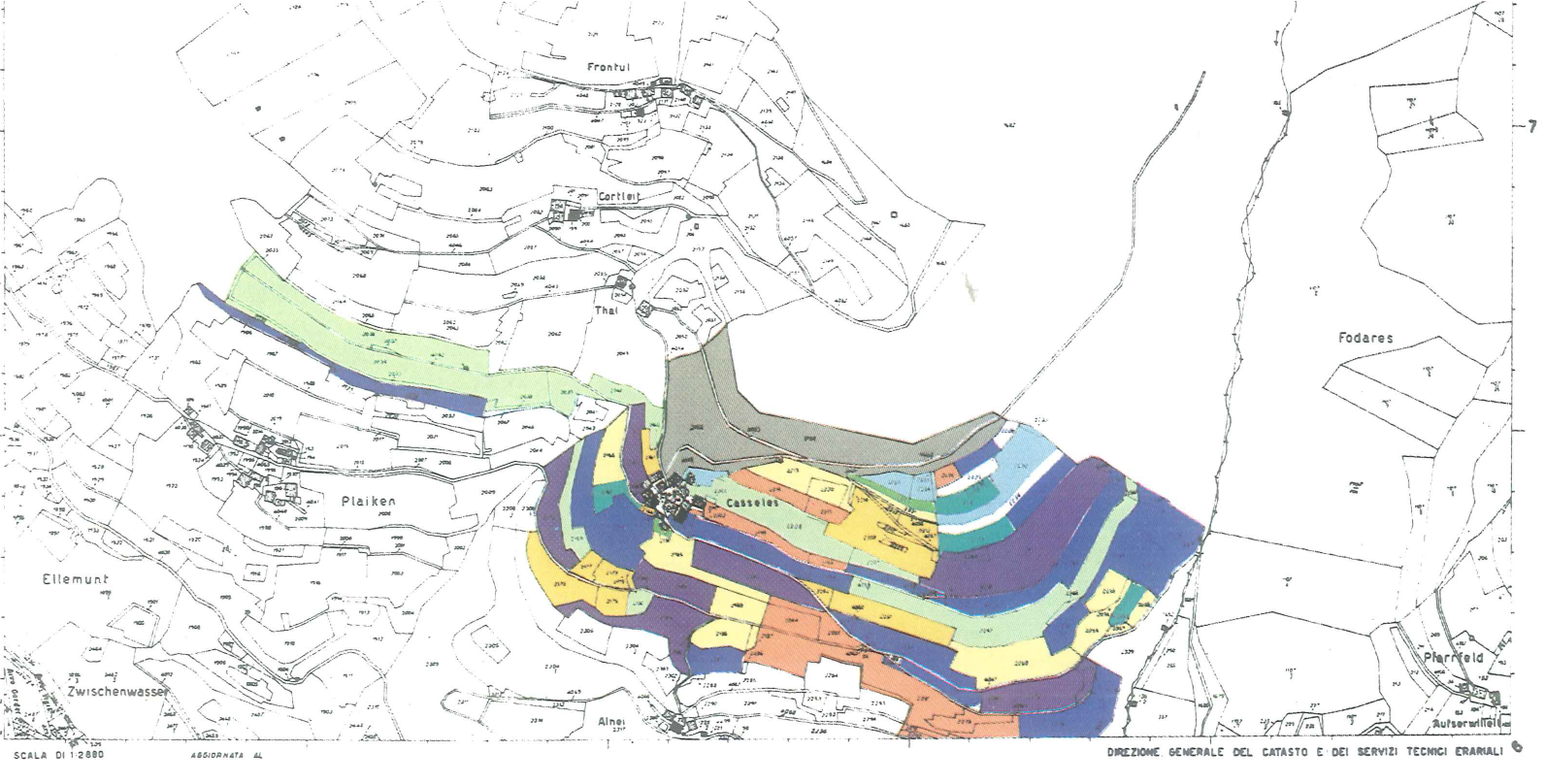 „Das gilt auch für einzelne Gebäude“, erläutert Piccolruaz: „Wenn sie geteilt wurden, dann selten einfach vom First bis zum Boden in zwei Hälften, sondern Raum für Raum wurde zugewiesen, sodass die Qualitäten und Funktionen der Räume, die in die materiellen Anteile überführt wurden, möglichst gleichwertig sind.“ Auch dieser Umstand lässt auf eine weitestgehend solidarische Organisation der gemeinschaftlichen Daseinsvorsorge in den Viles schließen. „So ist es auch bei den Nutzgärten, die alle in einer Reihe in einer qualitativ einheitlichen Lage zu finden sind und in gleiche Stücke aufgeteilt sind.