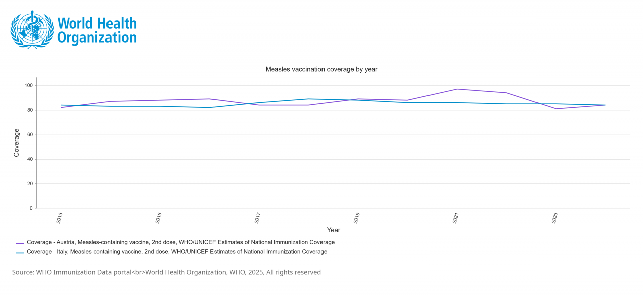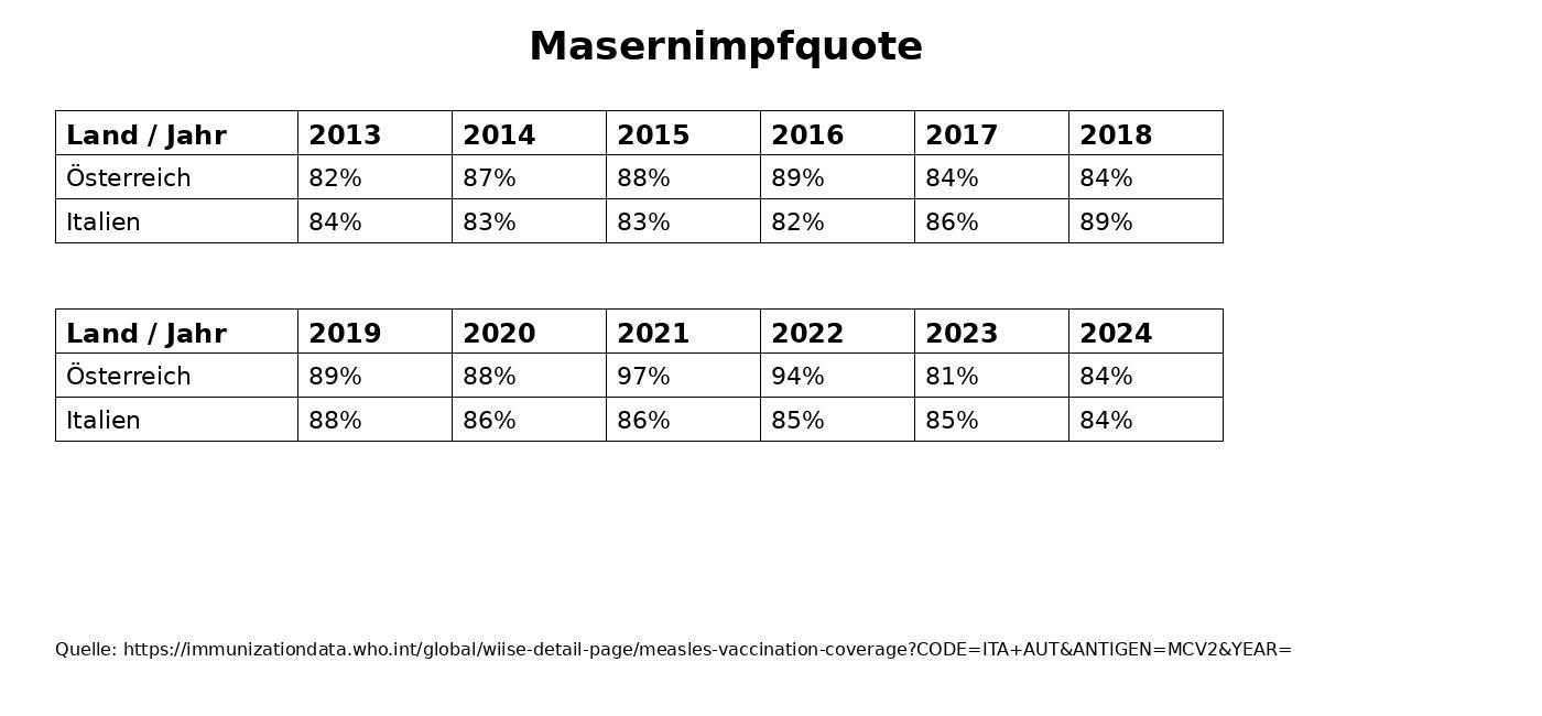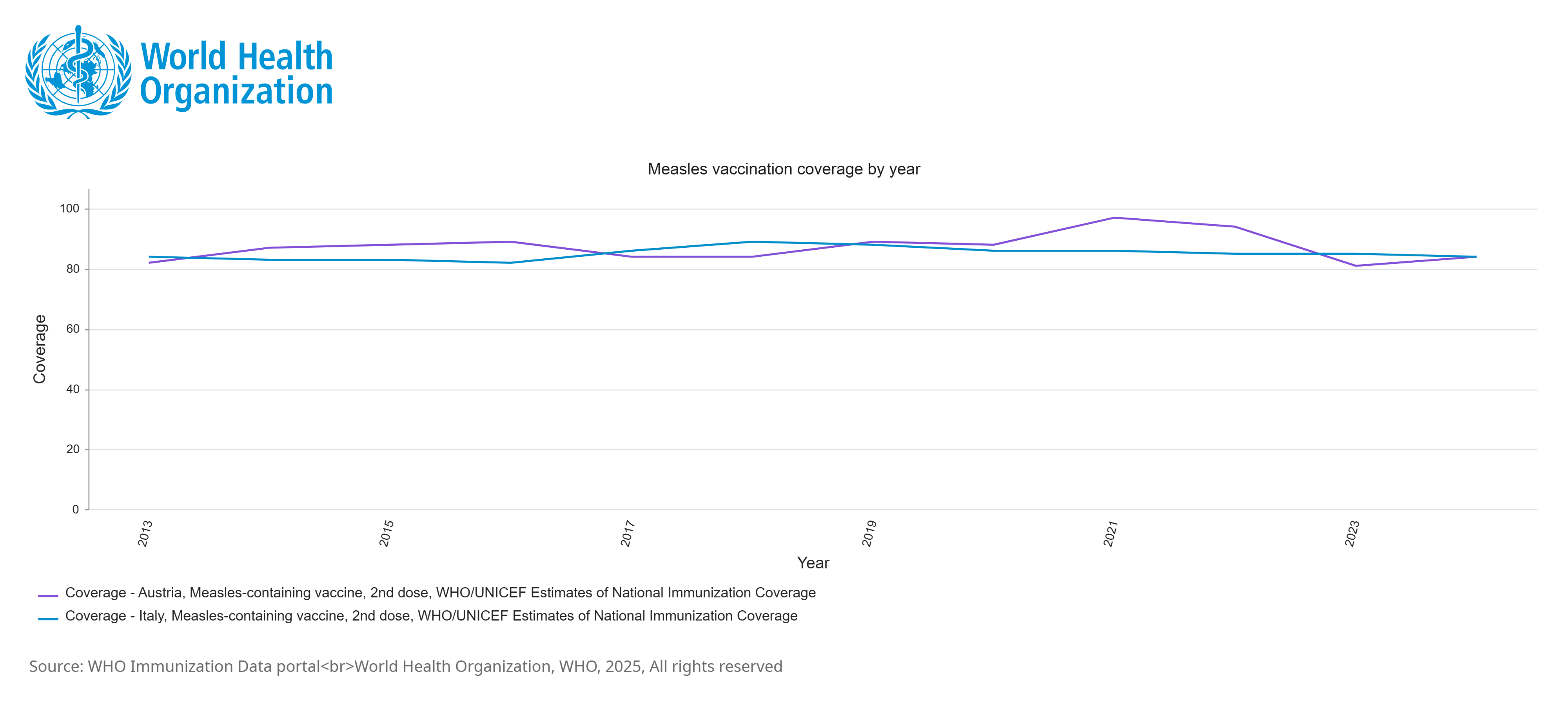 Trotz Impfpflicht steht Italien schlechter da als Österreich, obwohl die Ausgangswerte 2013 in Italien sogar besser als in Österreich waren.Nach 2021/22 kam es in Österreich zu einem starken Absinken der Impfquote, was wahrscheinlich mit dem mit der Corona-Impfpflicht einhergehenden Vertrauensverlust zu erklären ist.