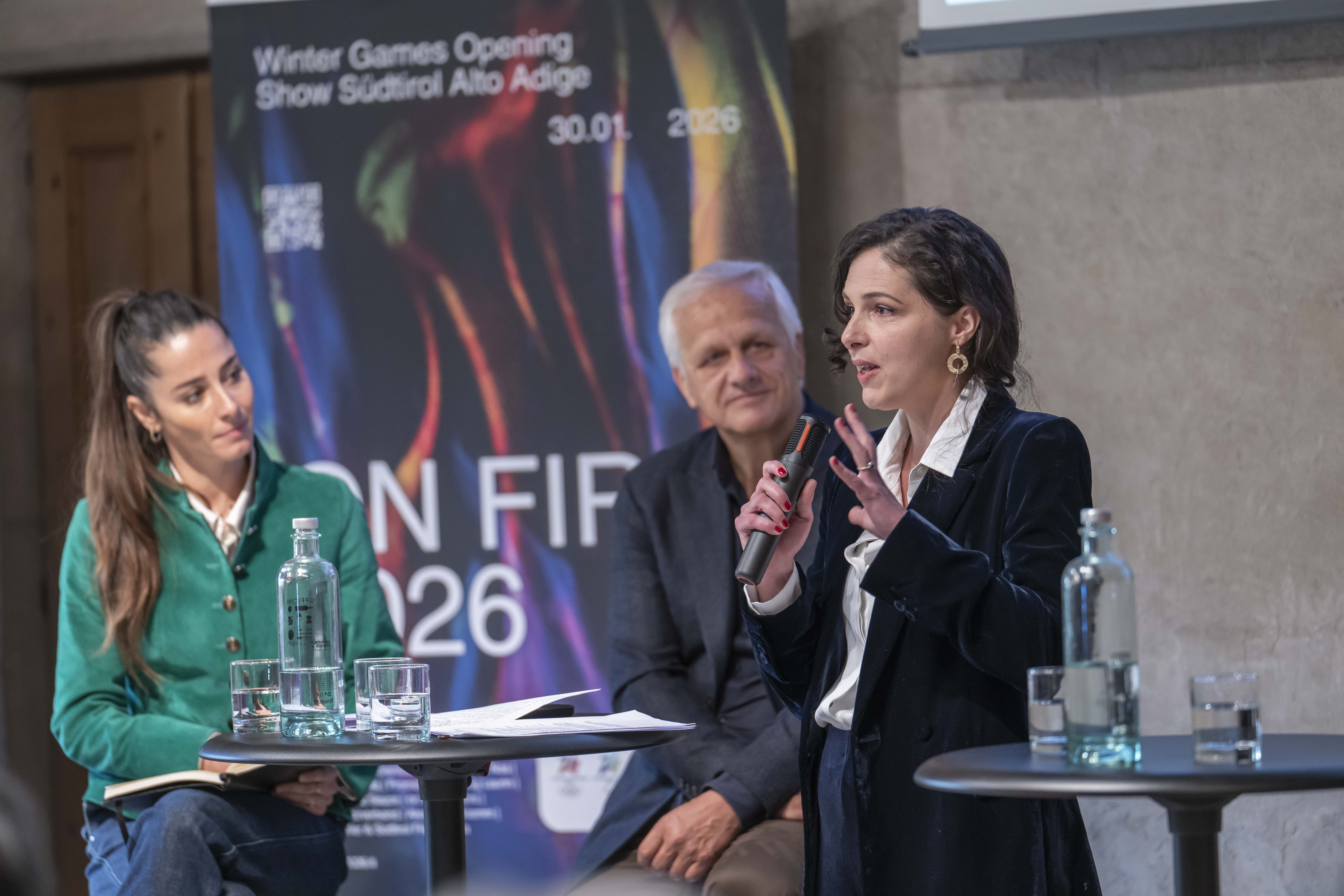 „Eine Hommage an den Olympischen Geist auf die Bühne Südtirols zu bringen, ist etwas ganz Besonderes“, erklärt Regisseurin Sarah Scherer. Die Moderation der Abendshow übernimmt die ehemalige Eiskunstläuferin und Schauspielerin Caterina Gabanella. Begleitet wird sie von zwei noch sehr jungen Protagonisten. Die elfjährige Julia aus Bruneck wird die „Promothea“ spielen und der achtjährige Rafael aus Rodeneck den „König Laurin“. Die Figuren stammen aus der Mythologie: Der Titan Promotheus soll den griechischen Göttern das Feuer entrissen haben und der Fluch König Laurins die bleichen Felsen des Südtiroler Rosengartens bis heute bei Dämmerung in rote Farbe tauchen.