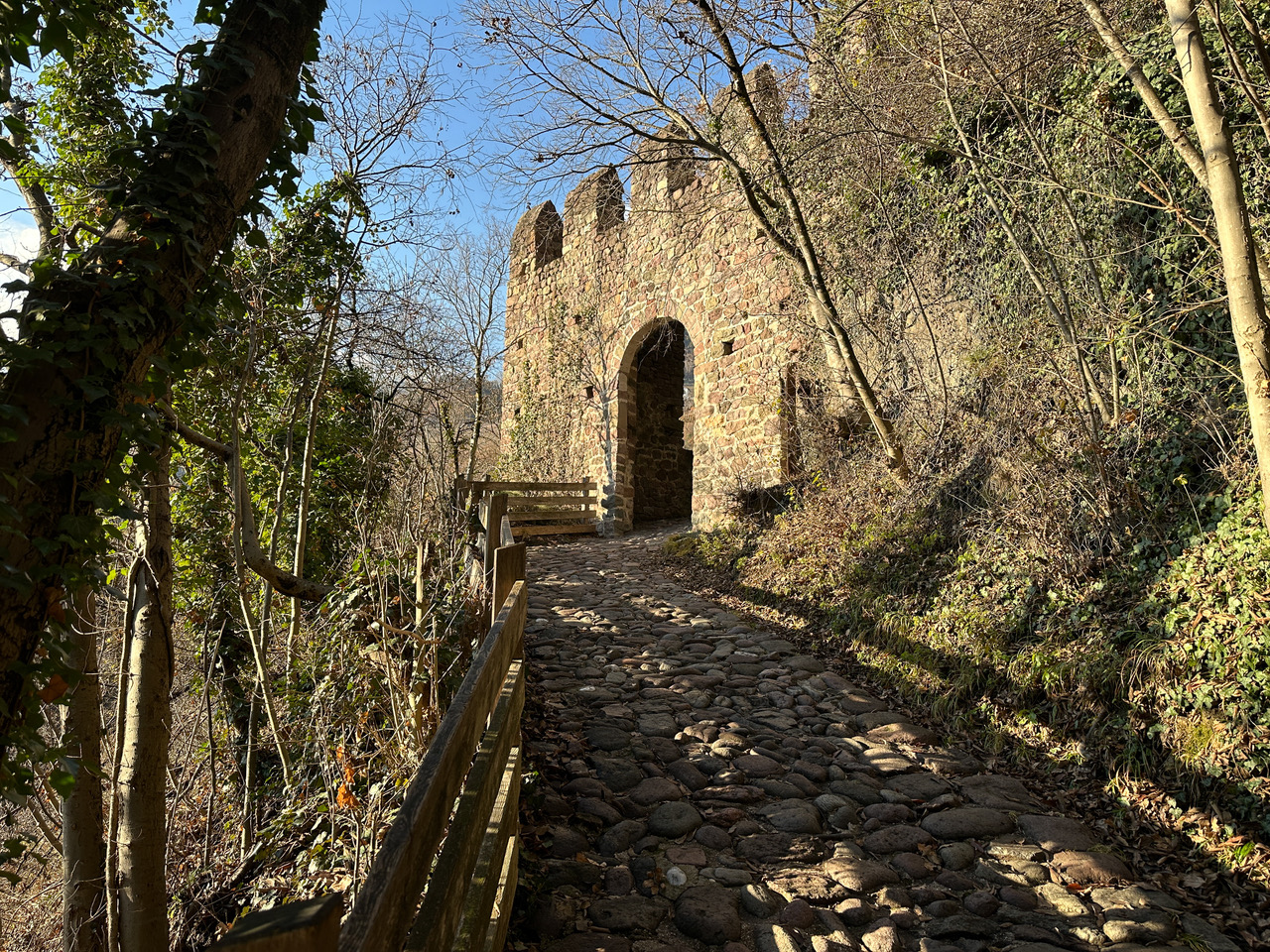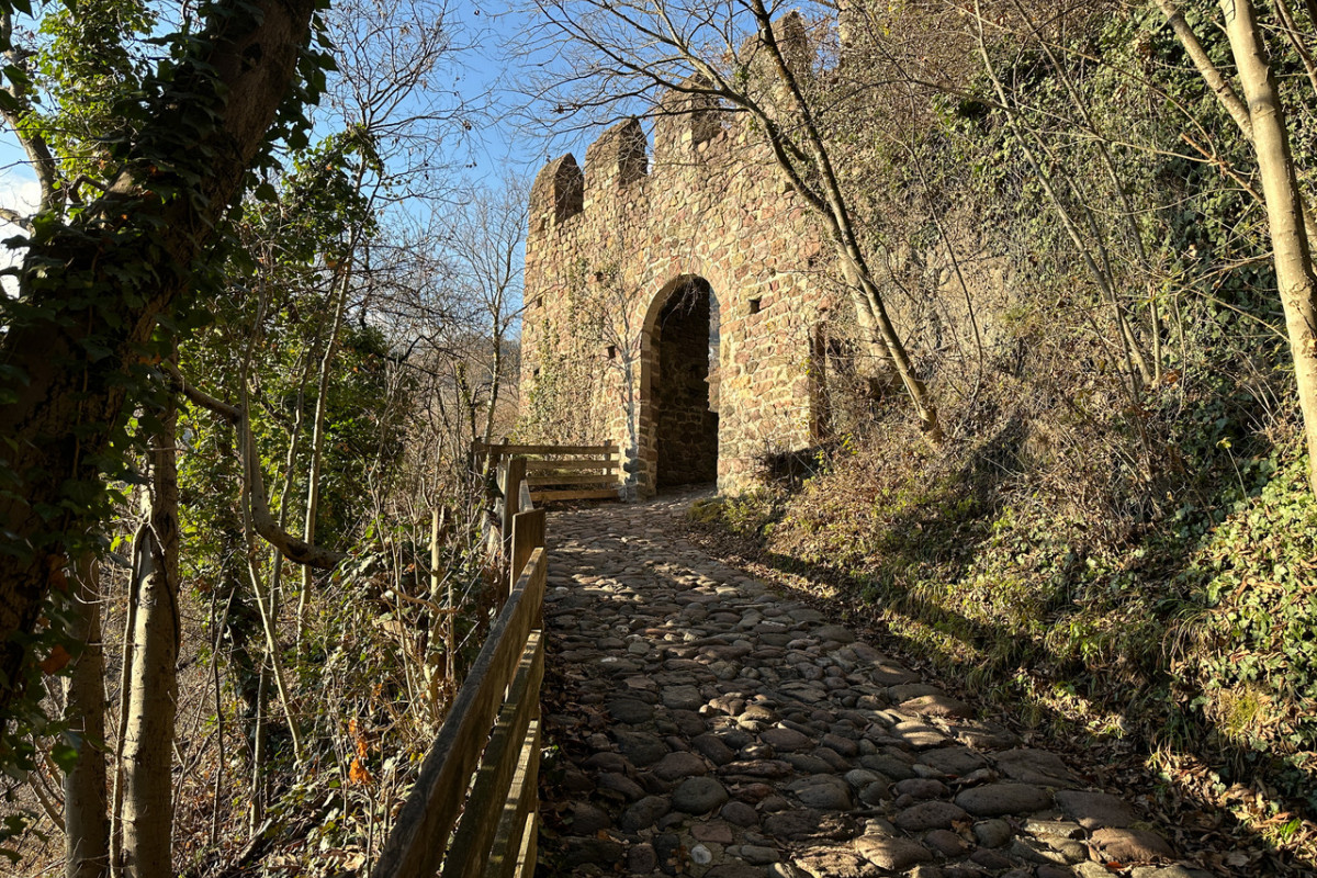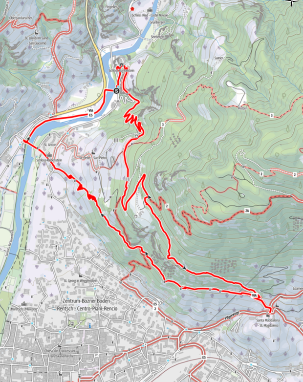 Am Beginn der Talferschlucht im Norden Bozens steigen wir auf dem grob gepflasterten Schlossweg in wenigen Minuten zur Burg Runkelstein (Einkehrmöglichkeit) auf. An der Burg vorbei führt der mit dem Symbol einer Kastanie gekennzeichnete Keschtnweg und der Nr. 2 markierte Weg (er führt auf den Ritten) in Kehren durch Buschwald bergauf, oberhalb des Weindörfchens St. Peter geht er an Weinreben entlang. Bei der Autozufahrt zum Weinhof Peterploner zweigt ein schmaler Steig ab, nach 10 Minuten Gehzeit ab dieser Kreuzung im Aufstieg verlassen wir den Kastanienweg, an der Abzweigung findet sich auf einem Baum eine rotweiße Markierung und das Symbol des Kastanienweges, wir biegen aber rechts auf einen Steig bergab, Achtung, dieser Steig ist nicht markiert, aber gut erkennbar, er führt vom unterhalb liegenden Peterploner herauf und weiter auf den Ritten.