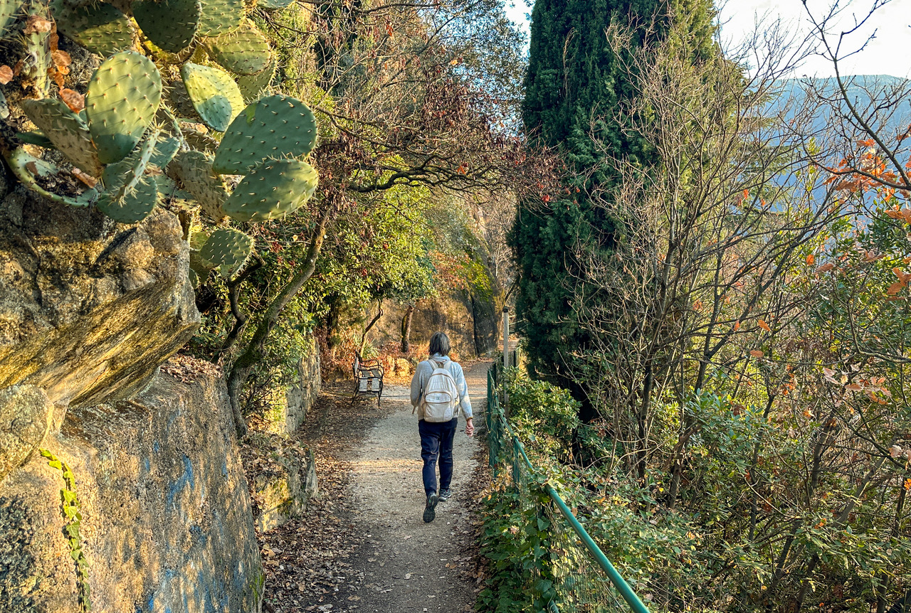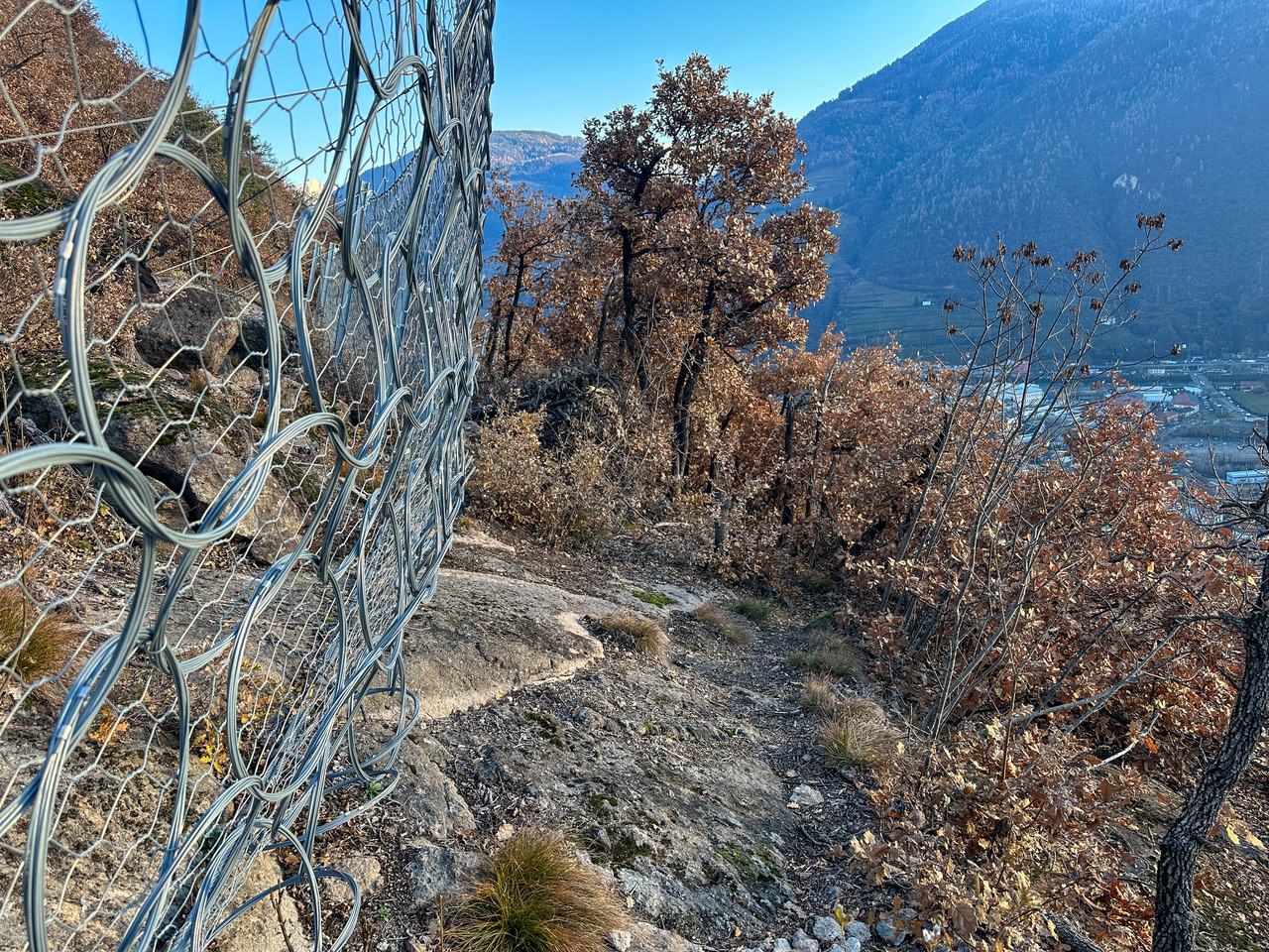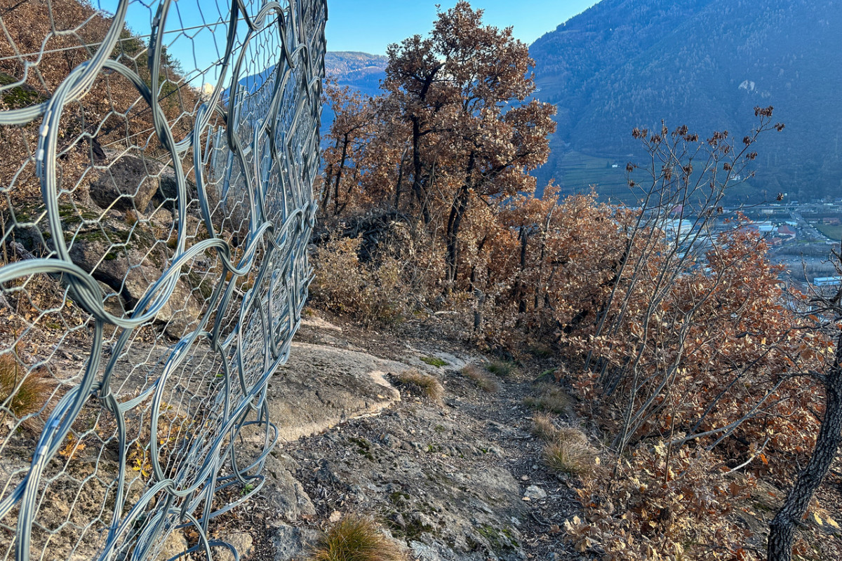 Der nun folgende Steigabschnitt wurde beim Bau von Steinschlagnetzen arg in Mitleidenschaft gezogen, er ist streckenweise von Felsbrocken übersäht, mit etwas Mühe und Vorsicht ist er begehbar und führt bergab bis zu den Häusern und dem Kirchlein von St. Magdalena. Hier stoßen wir auf die Oswaldpromenade und folgen dieser westwärts, am Hotel-Restaurant Eberle vorbei, das durch einen Felssturz teilweise zerstört wurde und nun geschlossen ist. Wir gehen den Wegweisern entlang nach St. Oswald in ebener Hangquerung westwärts. Die Streckenführung der Promenade ist einmalig, sie quert teilweise mit Bohlenwegen, die im Felsen verankert sind, dunkle Porphyrwände, am Weg treffen wir auf wärmeliebende Vegetation wie den Feigenkaktus, Perückenstrauch, Oliven, Federgras, Zypressen, Lorbeerarten und manch andere immergrüne submediterrane Pflanzen.