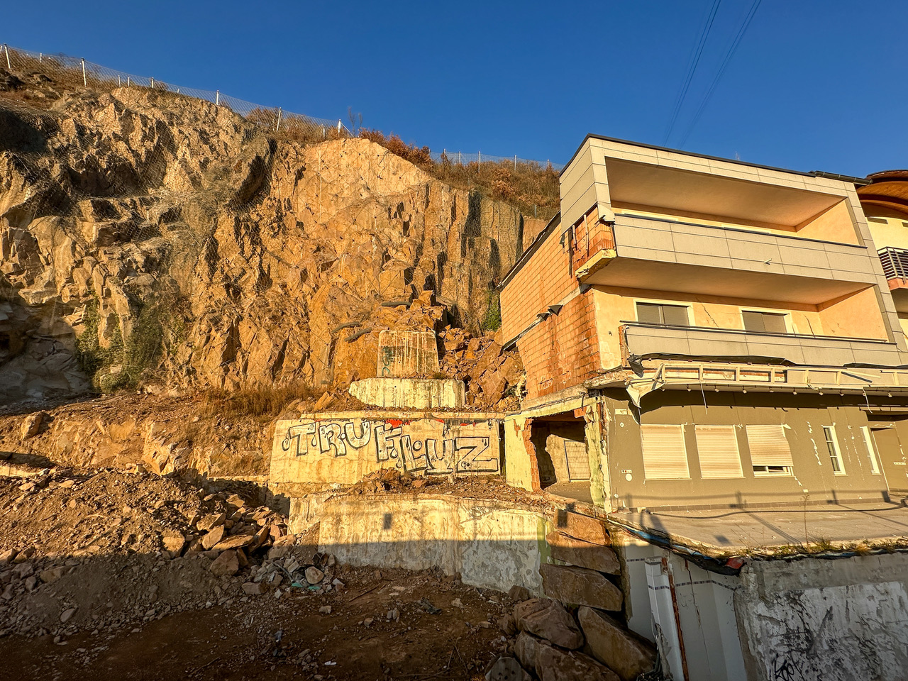 Nach ein paar Minuten Abstieg stoßen wir auf einen breit trassierten, etwas überwucherten Forstweg, dem wir in östlicher Richtung eben folgen. Unter uns ist durch die Büsche der Peterplonerhof zu erkennen, er hat von ein paar Jahren den Besitzer gewechselt und ist im Umbau, die Rebberge werden neu angelegt. Unsere Freude über den guten eben Weg währt nur kurz, er geht bald in einen holprigen Bergsteig über, der den felsdurchsetzten Buschwald quert.