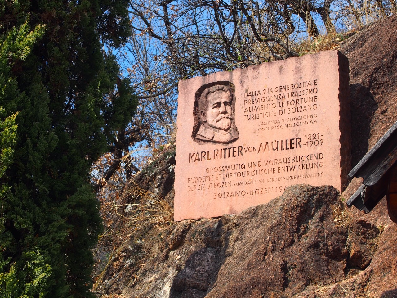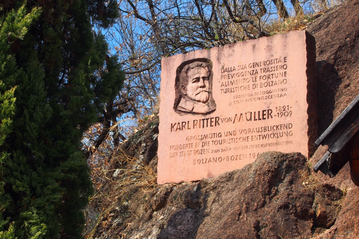 An der Wegkreuzung der Oswaldpromenade ist ein Gedenkstein angebracht, der an einen Wohltäter Bozens erinnert. Karl Ritter von Müller (1821 Benediktbeuern, 1909 Bozen) war ein deutscher Ingenieur und Bauunternehmer, der in München zu Wohlstand kam und seinen Altersruhesitz nach Bozen verlegte. In München erinnert das Müllersche Volksbad, ein Jugendstiljuwel, an ihn als Mäzen. Er vermachte dem „Curverein Bozen-Gries“ ein beträchtliches Vermögen. Die Bozner Kurverwaltung konnte mit diesem Geld die Oswaldpromenade vom Peter-Ploner-Weg bis St. Magdalena verlängern und zudem die Errichtung des städtischen Freibades (Lido) mitfinanzieren.