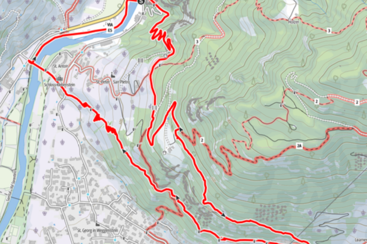 An der Wegkreuzung mit Porphyrsäule, Ruhebänken, Wegkreuz, Gedenkstein an Karl v. Müller folgen wir dem Wegweiser nach St. Anton, langsam senkt sich der Weg in unzähligen engen Kurven bis nach St. Anton an der Straße ins Sarntal. Bushaltestelle bei Klebenstein. Wer seinen PKW bei Runkelstein geparkt hat, geht auf der Sarntaler Straße in 10 Minuten zum Ausgangspunkt zurück.