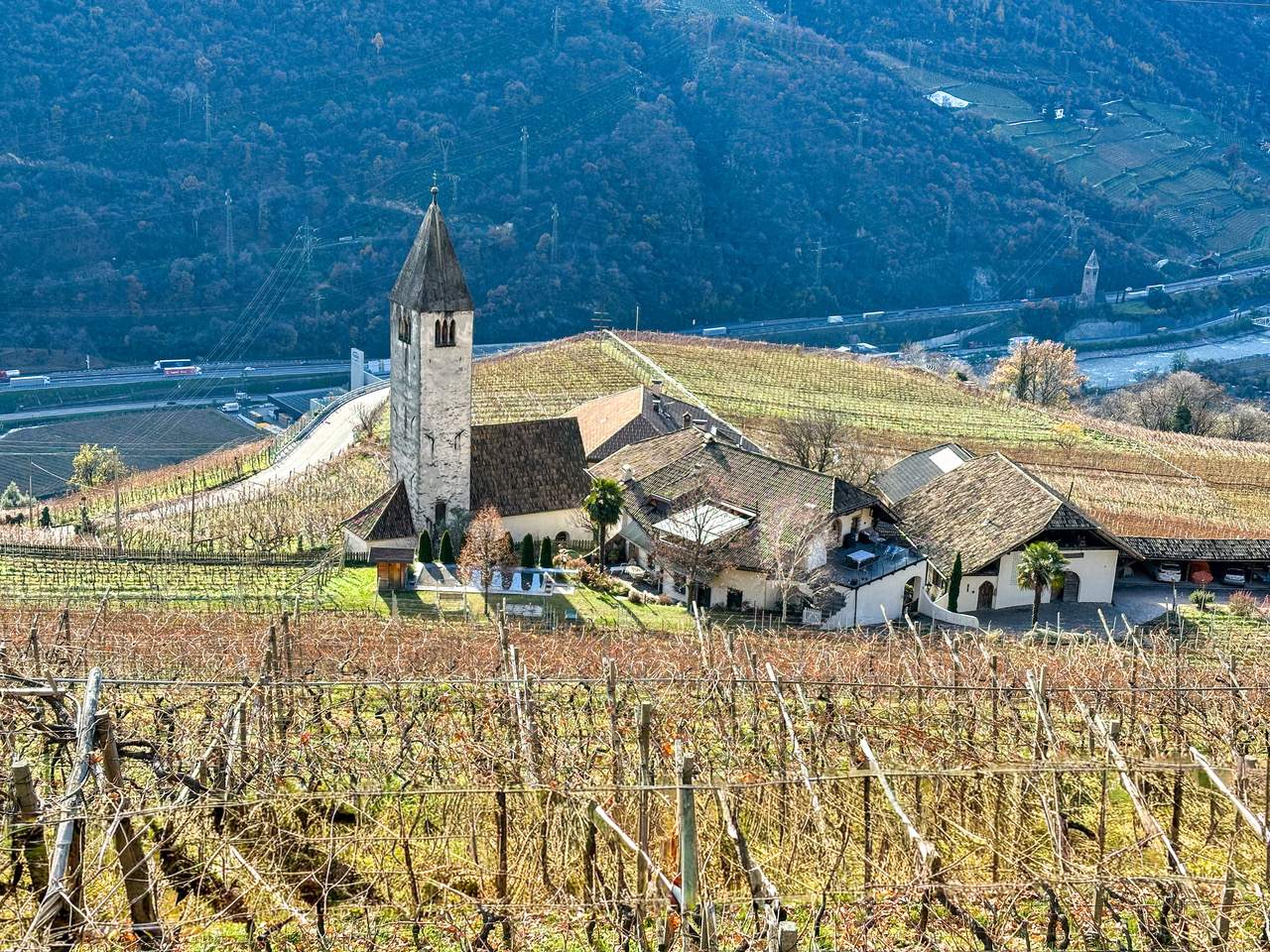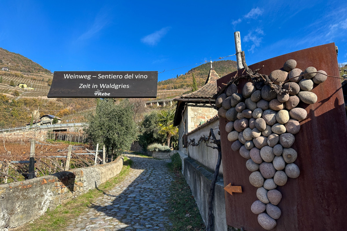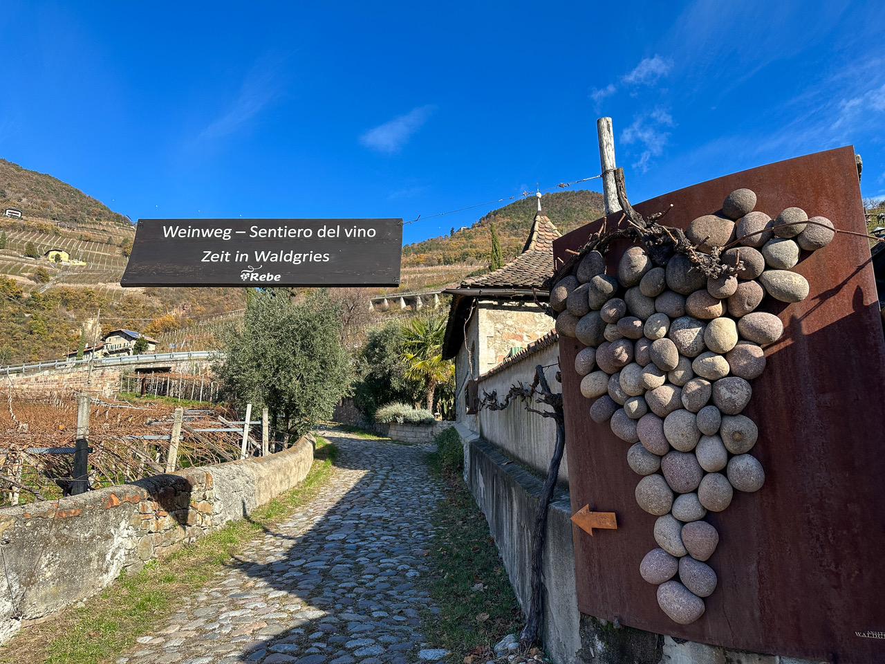 Wir starten an der Brücke über den Rivelaunbach in Rentsch. Nach wenigen Schritten verlassen wir beim ausladenden Weinhof Waldgries die viel befahrene Rittner Straße, nun beginnt der mit roten Schildern und der Schrift "Rebe" gekennzeichnete Wanderweg. Es geht durch Weinberge, an Steilstücken finden wir Treppen, bei den wenigen Häusern von St. Justina queren wir die Rittner Straße.