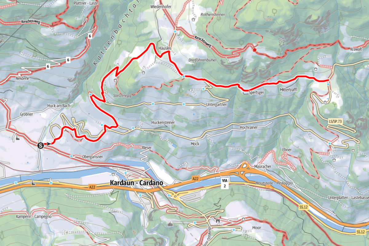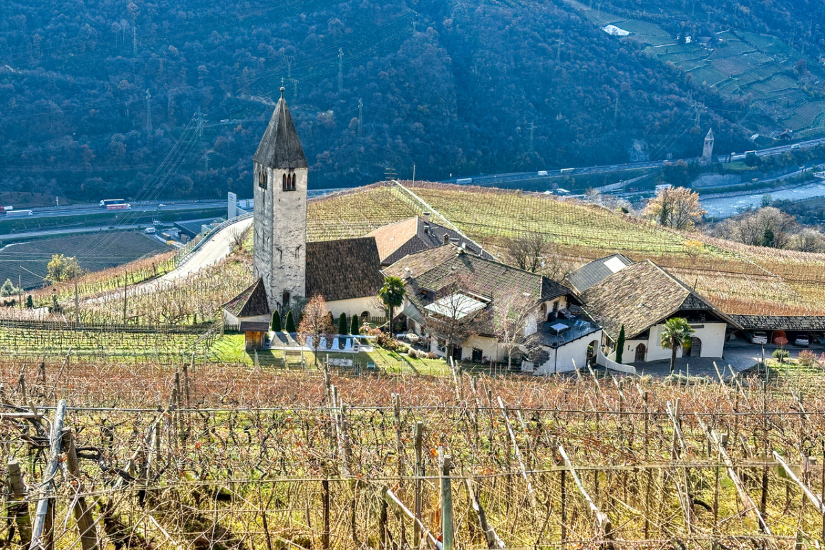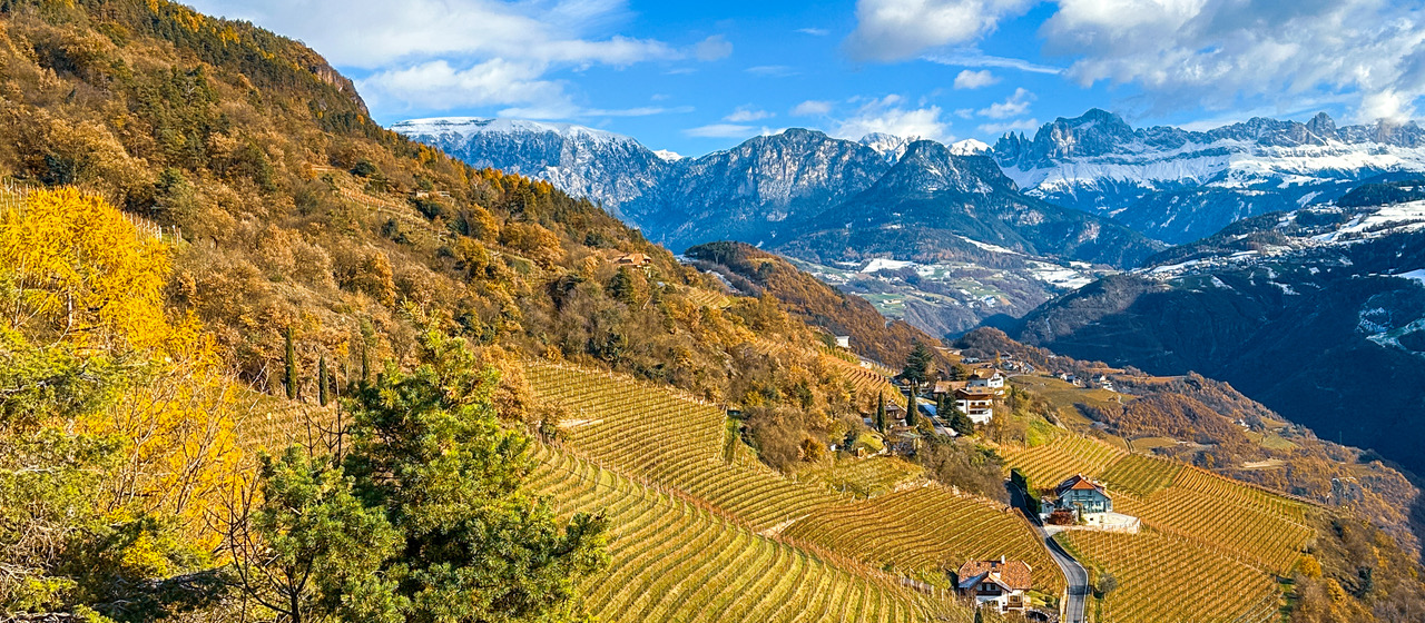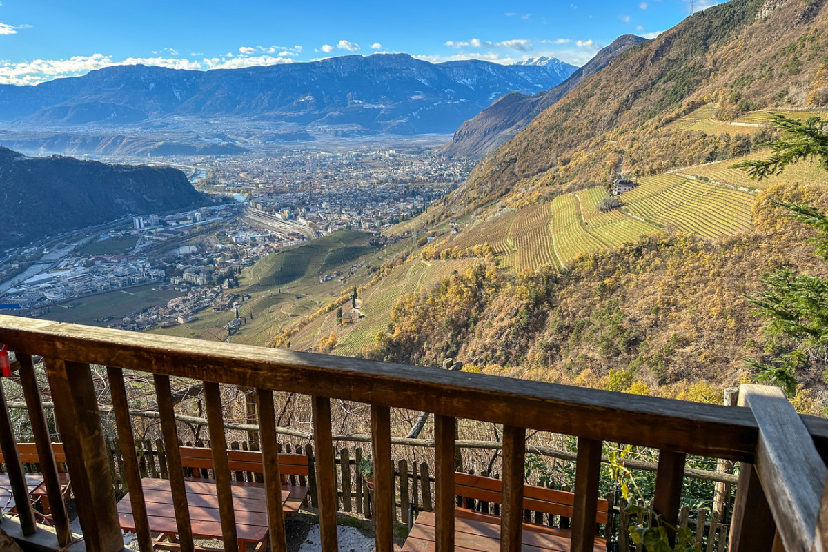 Wir starten an der Brücke über den Rivelaunbach in Rentsch. Nach wenigen Schritten verlassen wir beim ausladenden Weinhof Waldgries die viel befahrene Rittner Straße, nun beginnt der mit roten Schildern und der Schrift "Rebe" gekennzeichnete Wanderweg. Es geht durch Weinberge, an Steilstücken finden wir Treppen, bei den wenigen Häusern von St. Justina queren wir die Rittner Straße.