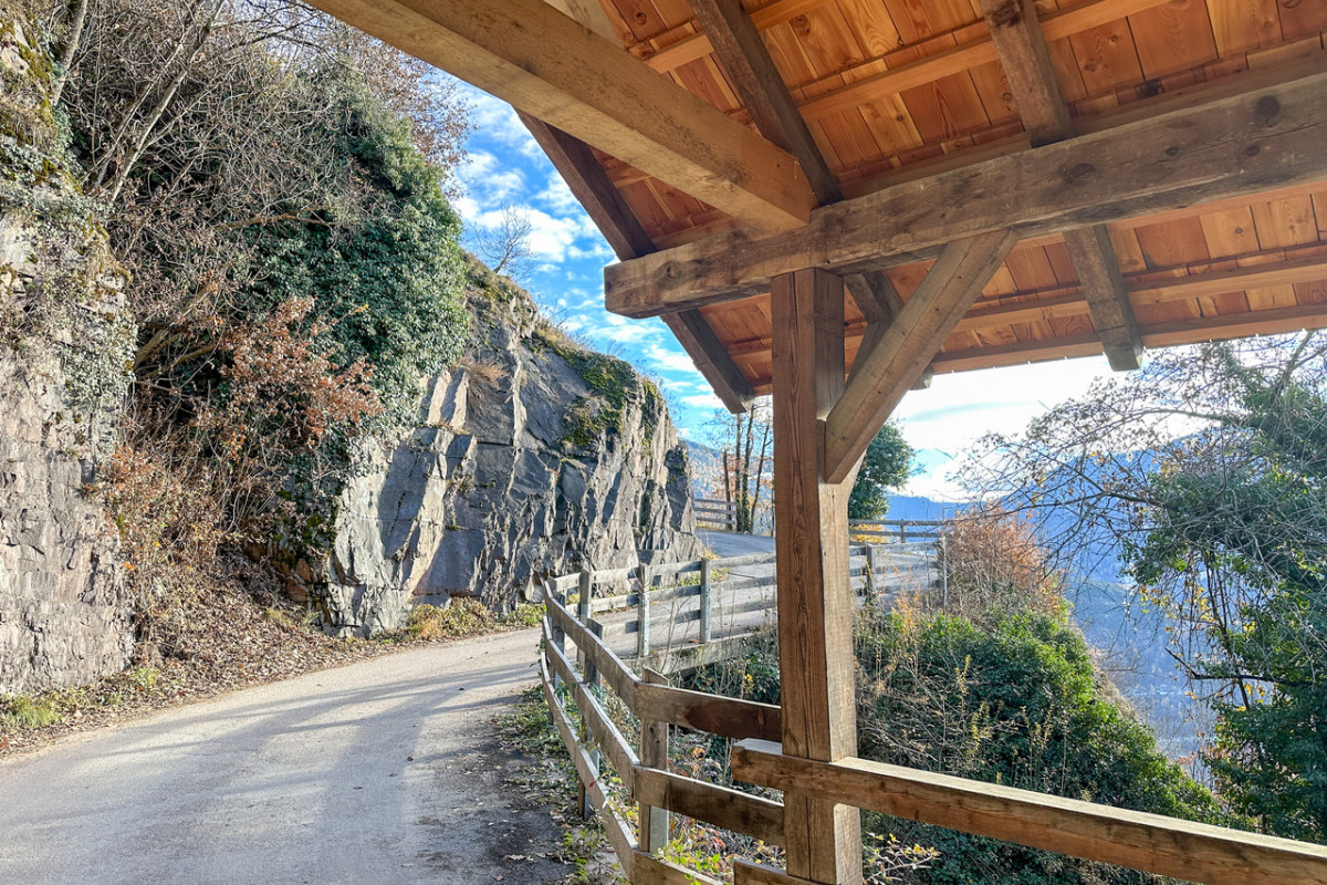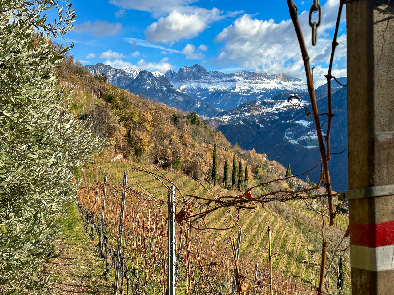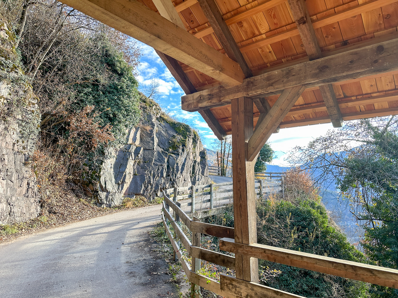 Dann folgen wir ein Stück der wenig befahrenen asphaltierten Signater Straße. Nach der Kehre beim "Stelzeregg" folgen wir links einem Waldsteig, der uns zum Bauern und Buschenschank Loosmann bringt. Ab diesem Hof ist der Weg zum größten Teil neu trassiert und quert eine steile, felsdurchsetzte Flanke mit schütterem Flaumeichenwald. Immer wieder gibt es Aussichtsplattformen und Ruhebänke und es öffnen sich herrliche Blicke zum Rosengarten.