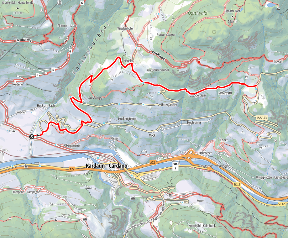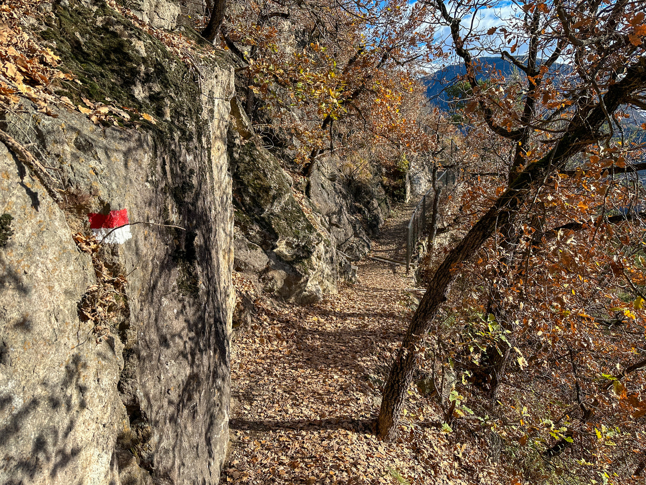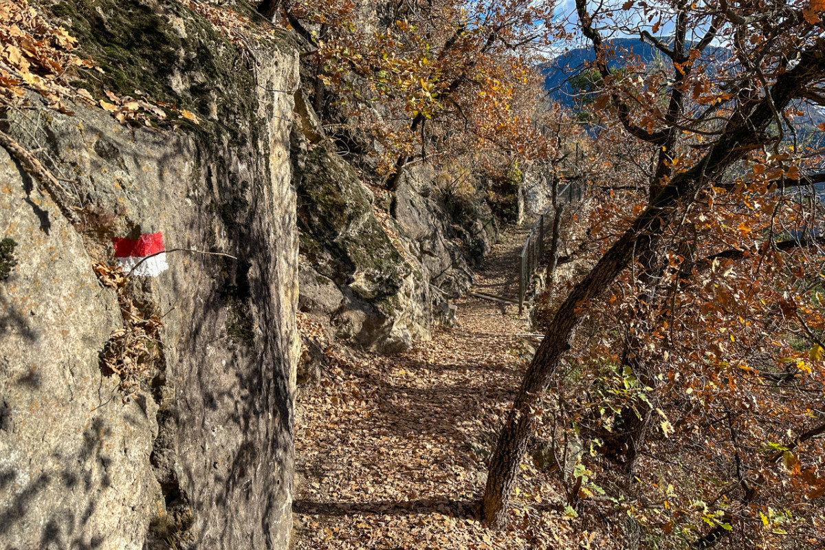 Dann folgen wir ein Stück der wenig befahrenen asphaltierten Signater Straße. Nach der Kehre beim "Stelzeregg" folgen wir links einem Waldsteig, der uns zum Bauern und Buschenschank Loosmann bringt. Ab diesem Hof ist der Weg zum größten Teil neu trassiert und quert eine steile, felsdurchsetzte Flanke mit schütterem Flaumeichenwald. Immer wieder gibt es Aussichtsplattformen und Ruhebänke und es öffnen sich herrliche Blicke zum Rosengarten.