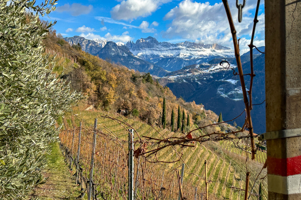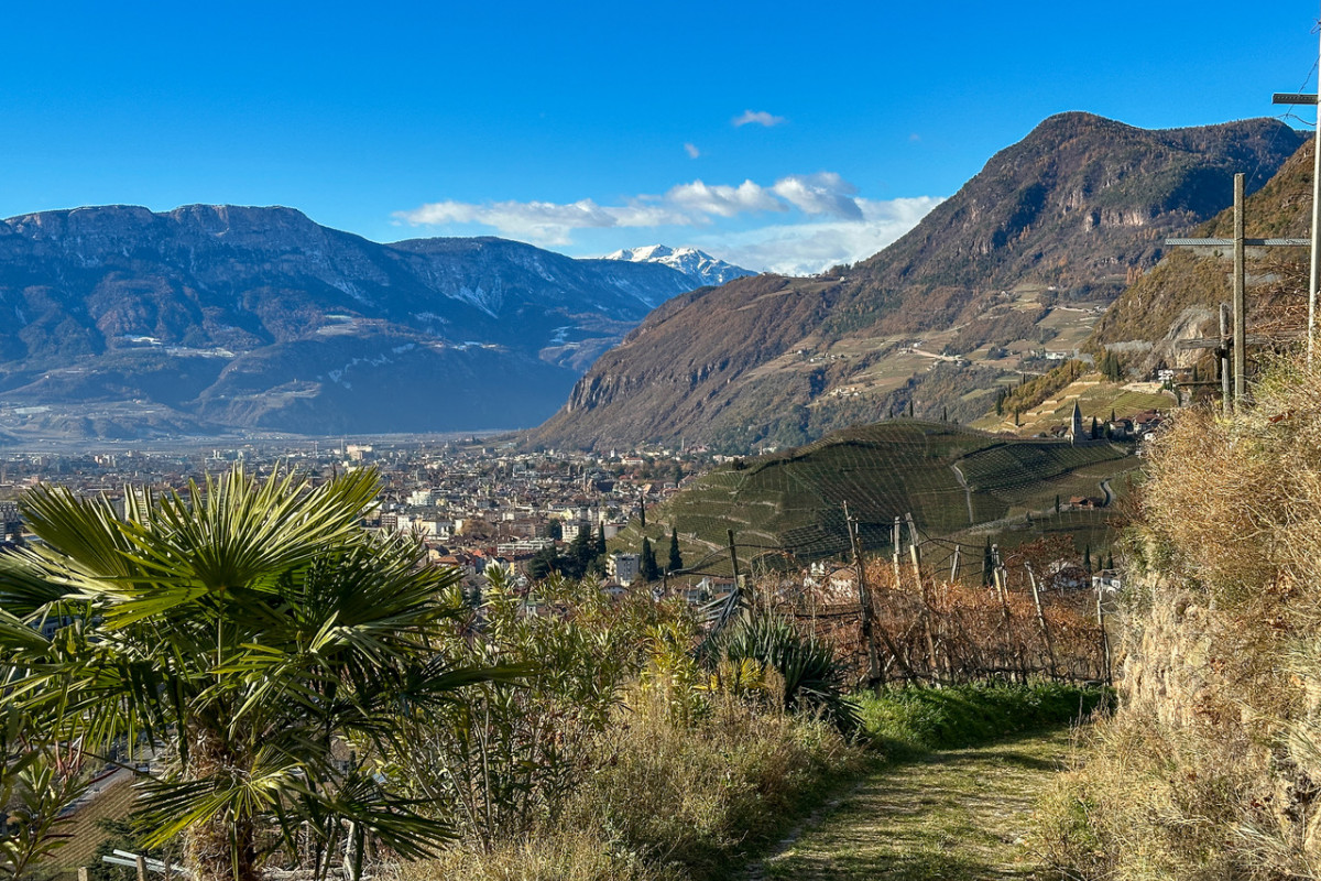 In der offiziellen Beschreibung dieses Wanderweges wird empfohlen, im Rittner Weiler Signat zu starten und nach Bozen bergab zu gehen, ich bin dieser Empfehlung nicht gefolgt und von Bozen aufgestiegen, das macht zwar etwas mehr Mühe, ist aber knieschonender. Der Weg ist vielseitig, er ist eine Kombination aus alten, grob gepflasterten Steigen, neu trassierten Wegstücken und kurzen Asphaltabschnitten, er geht durch schönste Weinberge, flankiert von mediterraner Vegetation, denn am Wegesrand wachsen Zypressen, Oliven, Lavendel, Rosmarin, Mandelbäume, Palmen, Oleander, Myrten und Yucca-Palmen, um nur einige der wärmeliebenden Pflanzen zu nennen.