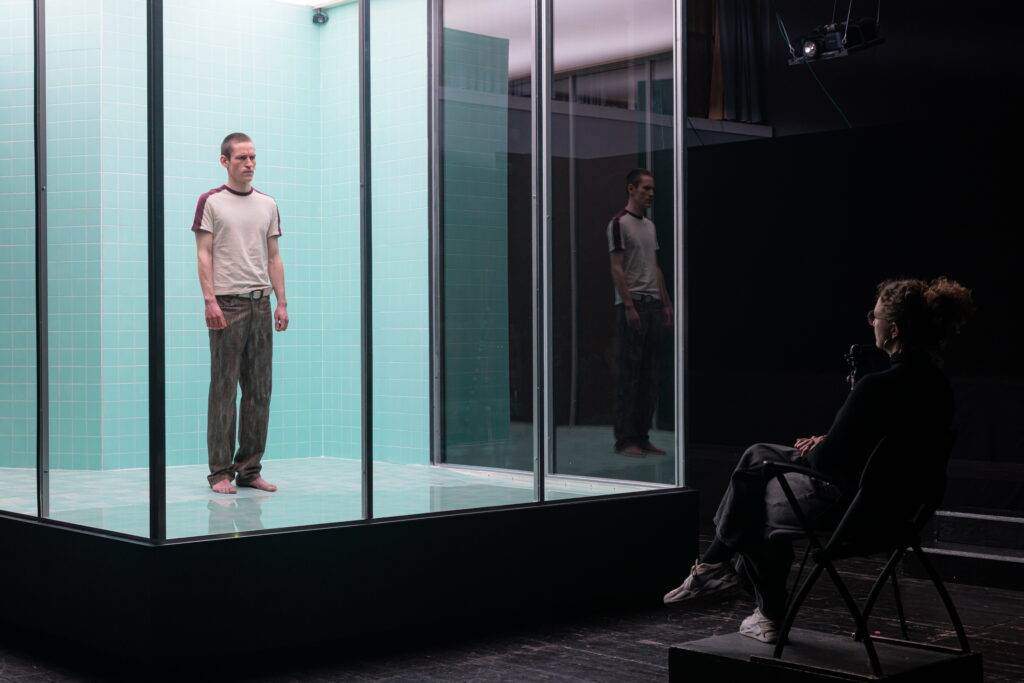 „Ich spreche mit dir, weil ich niemanden habe, mit dem ich sprechen kann“, sagt der Schauspieler Fynn Engelkes, im Glaskubus, zu einer ausgewählten Person, die zwischen ihm, Scheibe und dem Publikum sitzt. Das Publikum, das über einen dunklen Tunnel zur Aufführung gelangt und sich dort rings um den Bühnenkubus niederlässt, kann unmittelbar nach Beginn die Sogwirkung des genialen Textes miterleben, der knapp ein halbes Jahrhundert alt ist und doch so zeitlos wirkt wie ein frischer Bühnentext aus der Gegenwart.