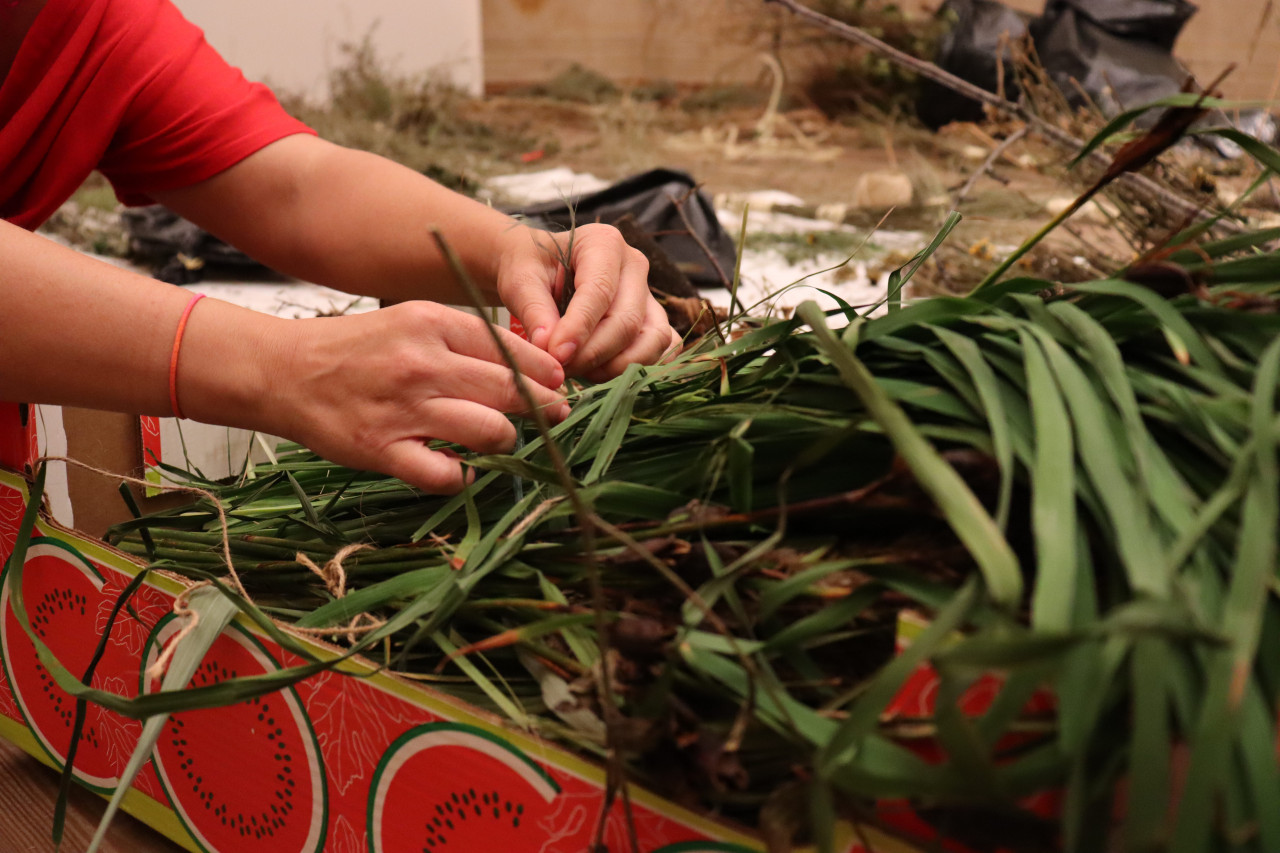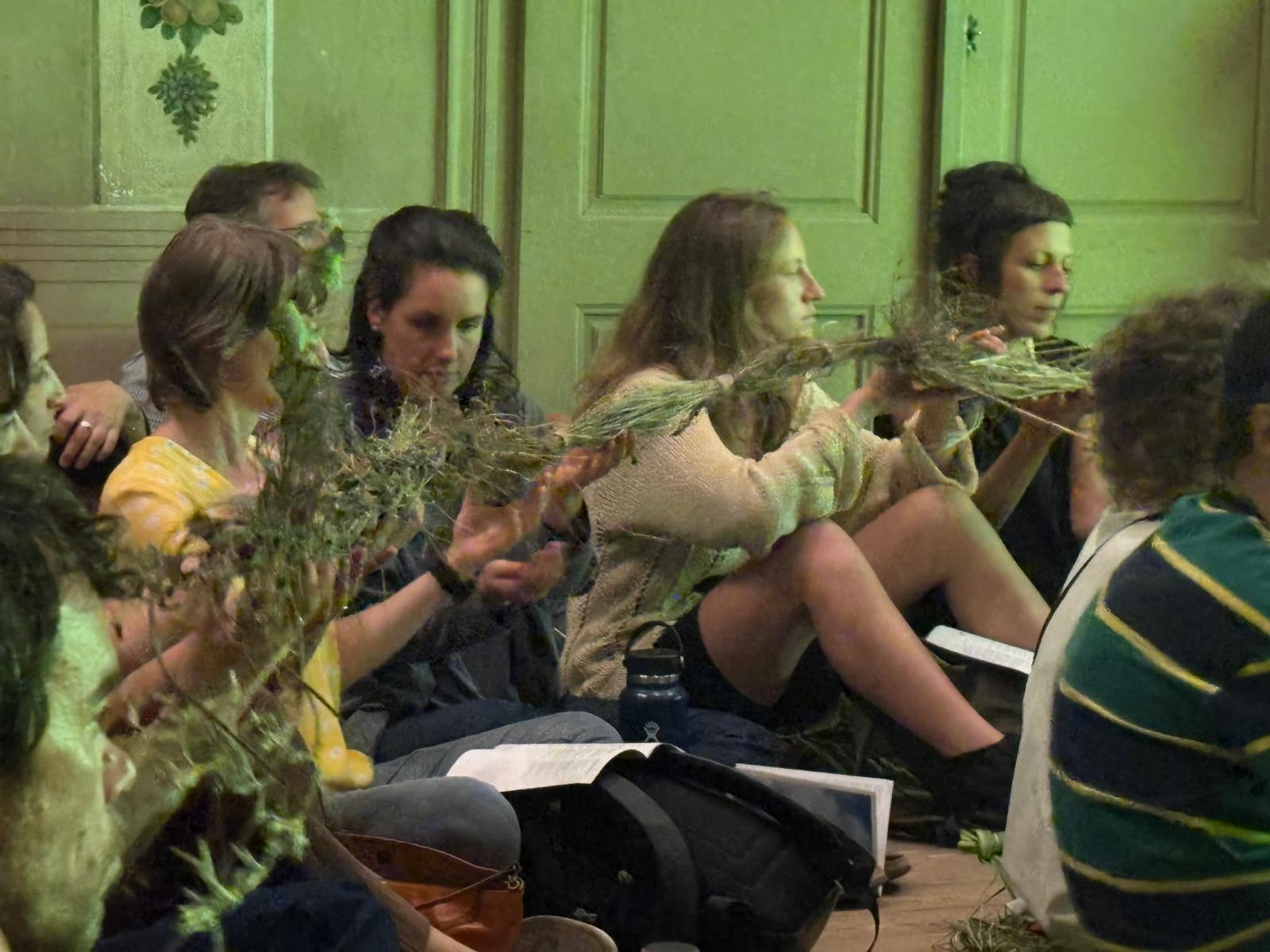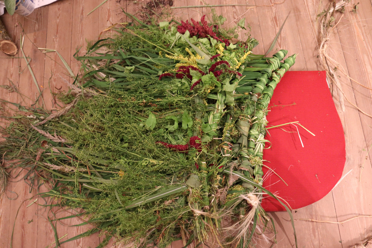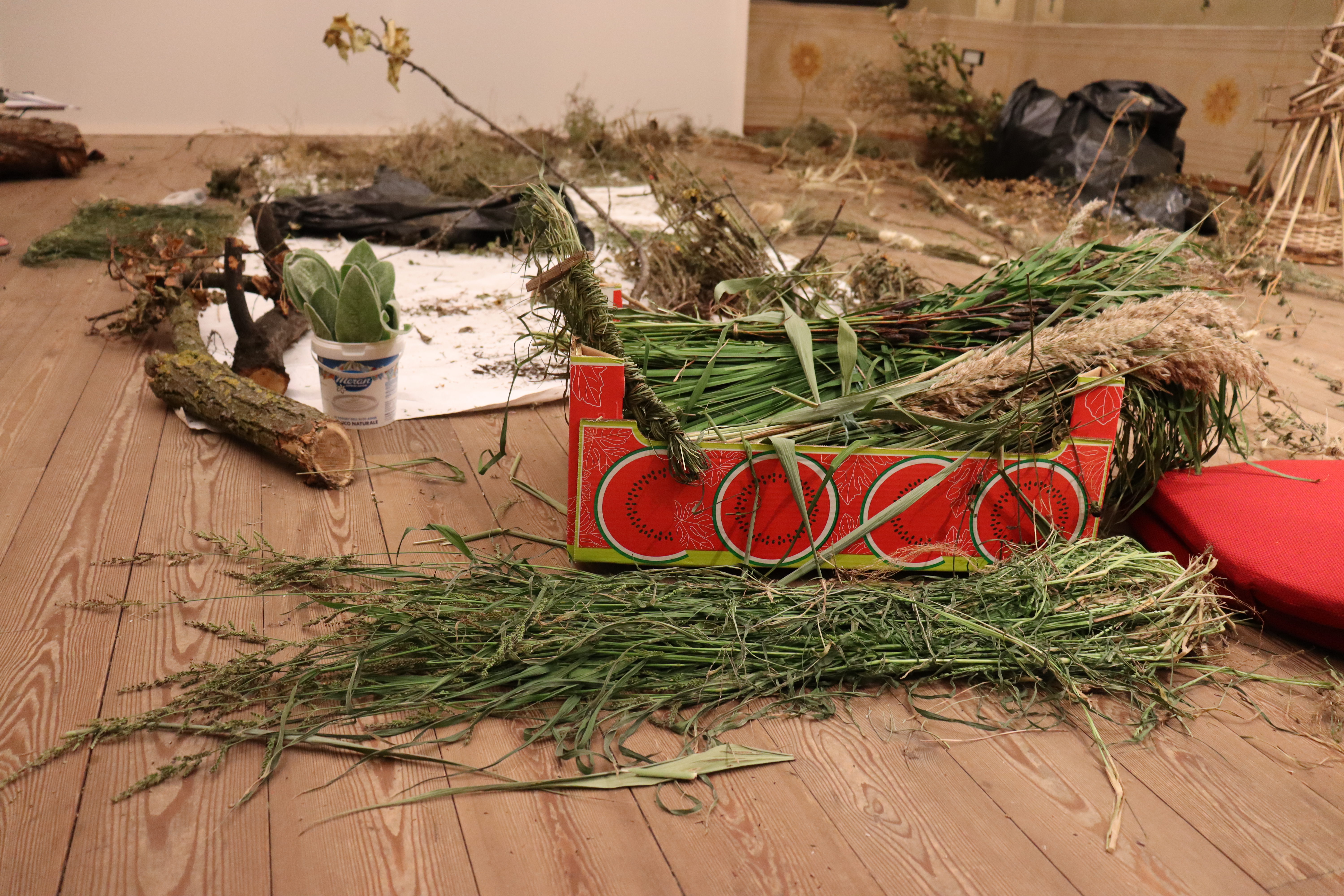 Gelis arbeitete mit den Stadtgärtner*innen Anni Schwarz und Stefan Dosser zusammen, welche ihr umfangreiche Einblicke in die Gärten von Meran ermöglichten. Aus diesen Gärten durfte sie Pflanzen als Material für ihre Skulpturen sammeln, die sie in der Performance einsetzte. Dabei fertigte sie geflochtene Matten aus Kräutern an, auf welche sich die Teilnehmer*innen der Performance setzten. Sie flocht lange Bänder aus Kräutern, die als Erweiterung der Pflanzen in Form von symbolischen Wurzeln galten, welche die pflanzliche und gesellschaftliche Landschaft Südtirols verbanden. Ihnen wurde damit ermöglicht, über die Erfahrung des Sehens und Hörens zusätzlich noch die Erfahrung des Fühlens und Riechens zu erleben. Darüber hinaus setzte Alexandra Gelis ein Lesegerät ein, welches sie über die Bilder des Videos hielt und zuvor aufgenommene Stimmen von italienisch-, deutsch- und ladinischsprachigen Südtiroler*innen wiedergab. Sie erzählten von den mundartlichen Bezeichnungen der Pflanzen und ihrer Beziehung mit ihnen. Technologie, organisches Material und Gemeinschaft traten so in Bewegung und Symbiose miteinander und formten einen Chorus. -