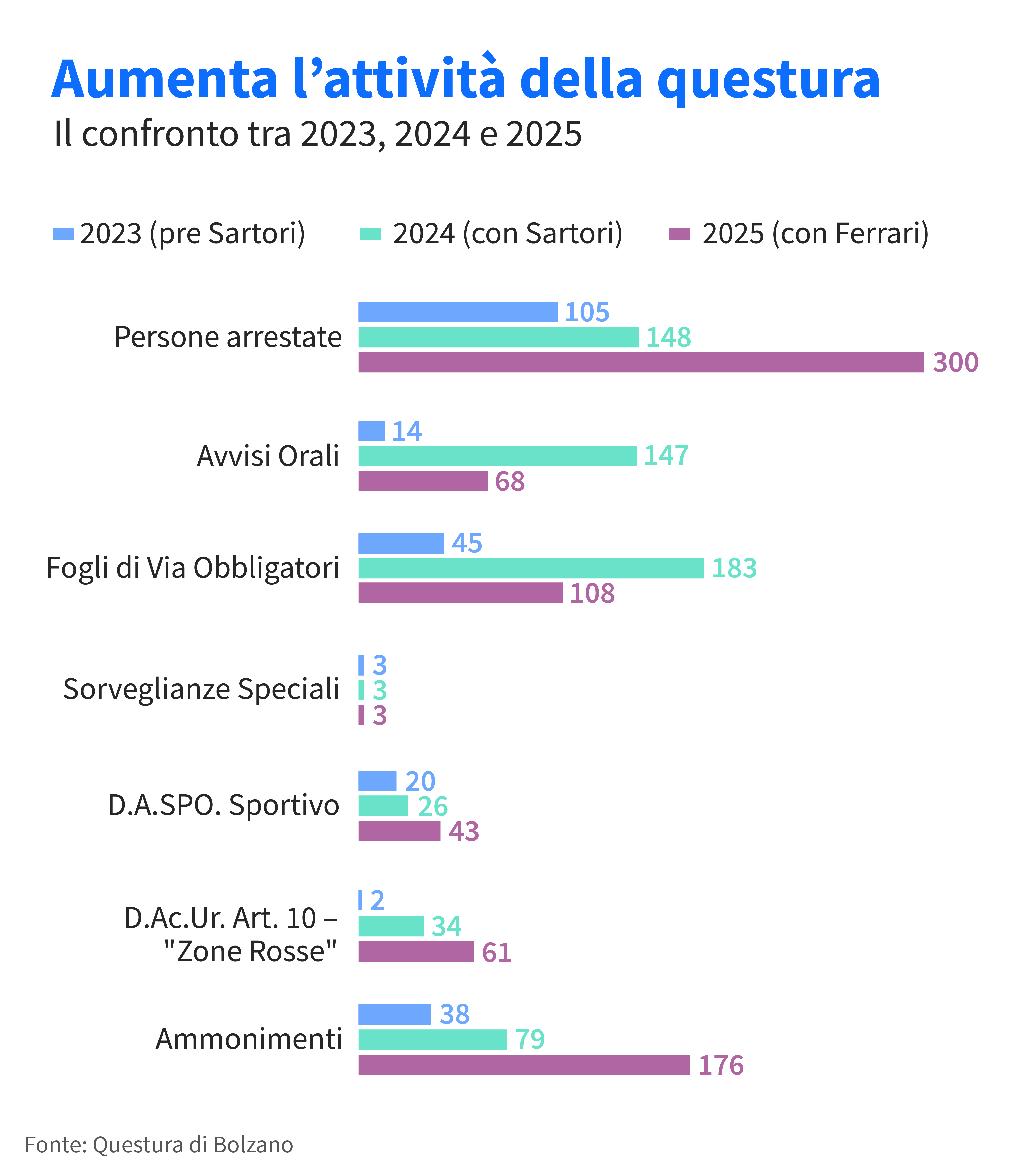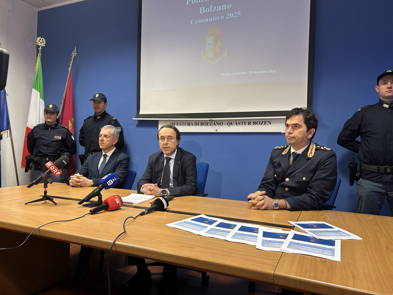 L’attività della Questura di Bolzano continua ad aumentare. I dati del 2025, condivisi oggi dal nuovo questore di Bolzano Giuseppe Ferrari per tracciare un bilancio dell’anno, parlano chiaro: sono raddoppiati gli arresti, passati da 148 nel 2024 a 300 nel 2025, sono aumentati anche i D.A.SPO. Sportivi (passati da 26 a 43, +165%) e i provvedimenti D.Ac.Ur. (Divieto di accesso alle aree urbane, anche detto DASPO URBANO) legati alle “Zone Rosse” della città (ne abbiamo scritto qui), che da appena 2 nel 2023 sono schizzati a 34 nel 2024, per arrivare a 61 nel 2025. Anche gli ammonimenti, utilizzati per situazioni come stalking o violenza domestica, sono più che raddoppiati, da 79 a 176, a dimostrazione di una maggiore sensibilità verso il contrasto di queste gravi problematiche ed anche di una maggiore propensione delle persone vittime a denunciare.