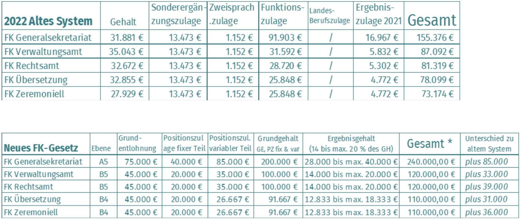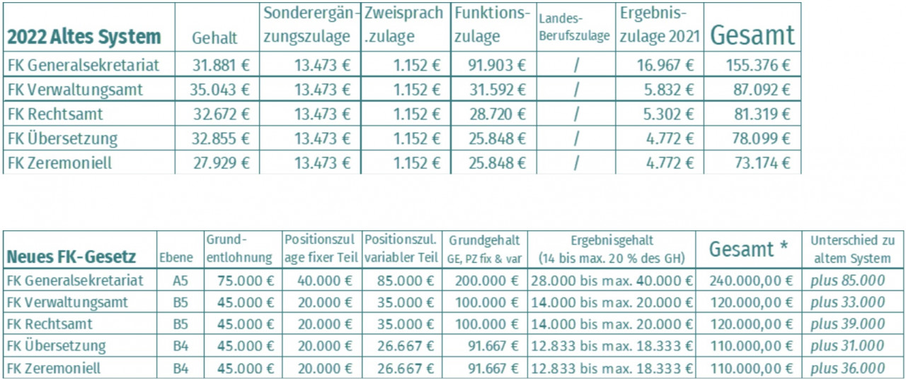 An der Spitze steht die neue Funktions- und Gehaltsebene A5. Drei Personen im Landesdienst erreichen – bei Gewährung der Zulage – ein Gesamtbrutto von bis zu 240.000 Euro. Laut Abgeordnetem Leiter Reber zeigt sich hier ein Missverhältnis: Während der Generaldirektor der Landesverwaltung Tausende Mitarbeitende und Milliardenbudgets verantwortet, führt der Generalsekretär des Landtags ein Haus mit rund 90 Beschäftigten und deutlich kleinerem Etat – ein Gefälle, das politisch erklärt werden müsse.
