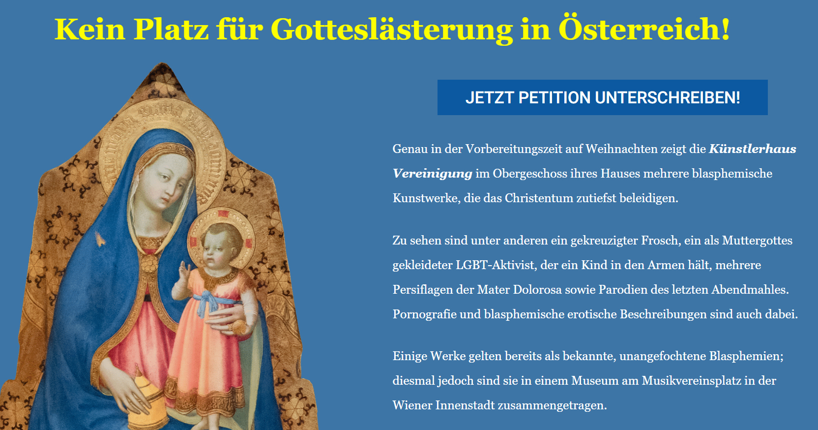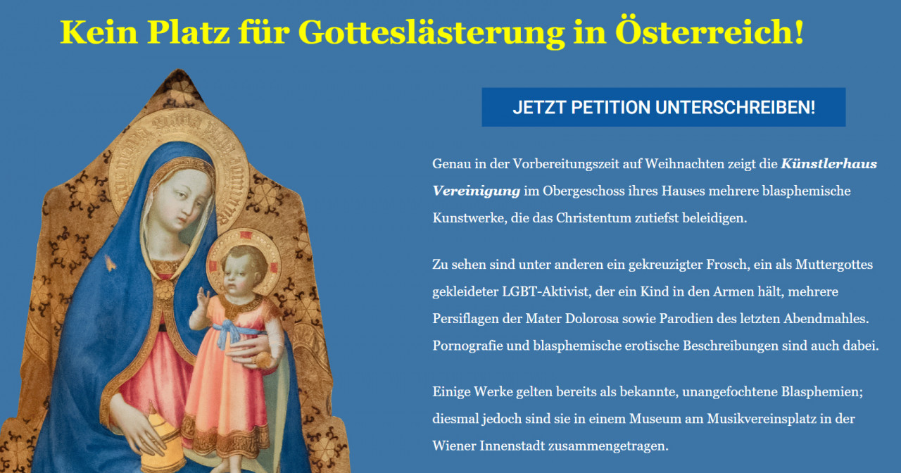 Vor zwei Wochen allerdings hat dann der Verein TFP (Tradition, Familie und Privateigentum) „wegen Gotteslästerung eine Petition gestartet“. TFP ist eine katholisch-traditionalistische und monarchistische Organisation mit zahlreichen Ablegern in mehreren Ländern. Mitglieder der TFP beteiligten sich in den vergangenen Jahren auch am rechtsextremen „Marsch für die Familie“ in Wien; der Verein stellt innerhalb der internationalen antifeministischen Bewegung eine der einflussreichsten und wirtschaftlich stärksten Organisationen dar.