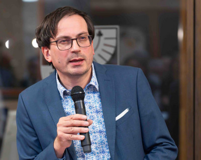 Im Antlitz des Kurators: Günther Oberhollenzer bei der Eröffnung der von ihm kuratierten Ausstellung ANTLITZ / VOLTO in der Sparkasse Bozen Ende November Foto: Sparkasse BozenÜber Wien und Österreich hinaus gelangte die Ausstellung DU SOLLST DIR EIN BILD MACHEN auch in die BILD-Zeitung. Auch die italienische Nachrichtenagentur ANSA berichtete gestern und erinnerte in der Meldung „Kippenbergers Frosch am Kreuz sorgt noch immer für Empörung“ an die Ausstellung 2008 in Bozen, als es im (schein)heiligen Südtirol zu Hungerstreiks, Interventionen des Bistums, Kritik aus dem Vatikan und sogar den Rückzug von Franz Pahls Kandidatur für die SVP bei den Landtagswahlen gekommen war.