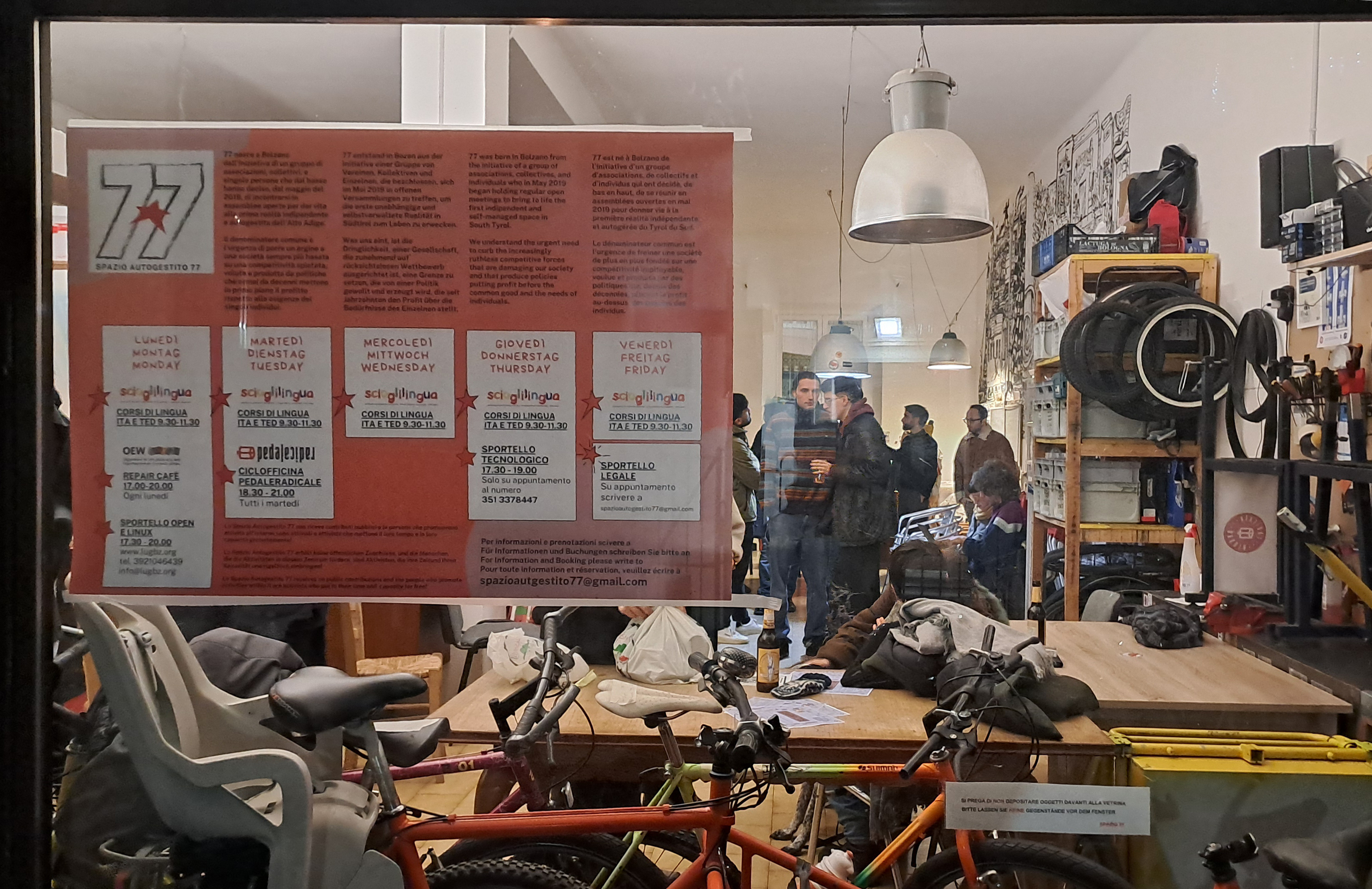 Autonomes Handeln statt Südtirol-AutonomieSpazio 77 ist ein autonomes, von Ehrenamtlichkeit getragenes Raum-Projekt in der Bozner Dalmatienstraße Nr. 77. Die Initiative hat sich seit wenigen Jahren das Ziel gesetzt, soziale Barrieren abzubauen, Integration zu fördern und gemeinsame Aktivitäten im Dienste eines besseren Zusammenlebens anzubieten. Angeboten werden Repair-Cafés, Computerkurse, Beratungs- und Infoangebote, kulturelle und politische Veranstaltungen und vieles mehr. Vergleichbare basisdemokratische Einrichtungen waren bereits in der Geschichte immer von großer Bedeutung und Zünder, wenn die gewählte Politik nicht imstande ist, ihrem Auftrag nachzukommen.