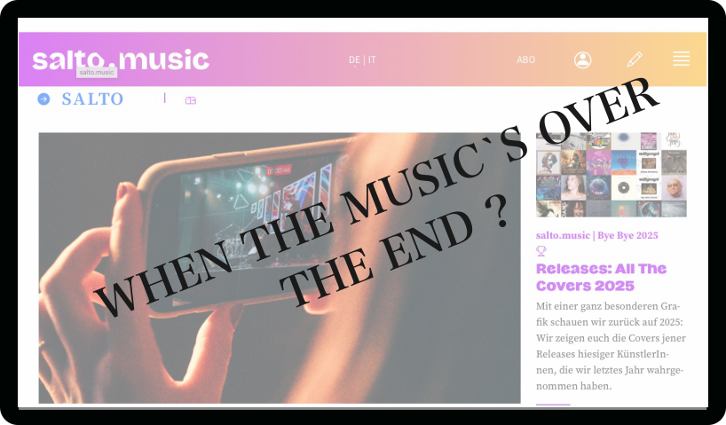 Ich finde es immer noch verdammt schade, dass salto.music diese Änderungen, bzw. Neuausrichtung erfährt. Für mich war es ein Alleinstellungsmerkmal für salto.bz. Wie man solch Fachwissen und Herz ziehen lassen kann, verstehe ich immer noch nicht. Aber ich kenne ja die internen Vorgänge und Zahlen nicht. Ich hoffe halt, dass Reinhold und Eva irgendwie der Szene erhalten bleiben. Ich denke, sie werden gebraucht. Hoffe letztlich auch, dass ich Niemanden zu Nahe getreten bin.. . Nichts für ungut!
