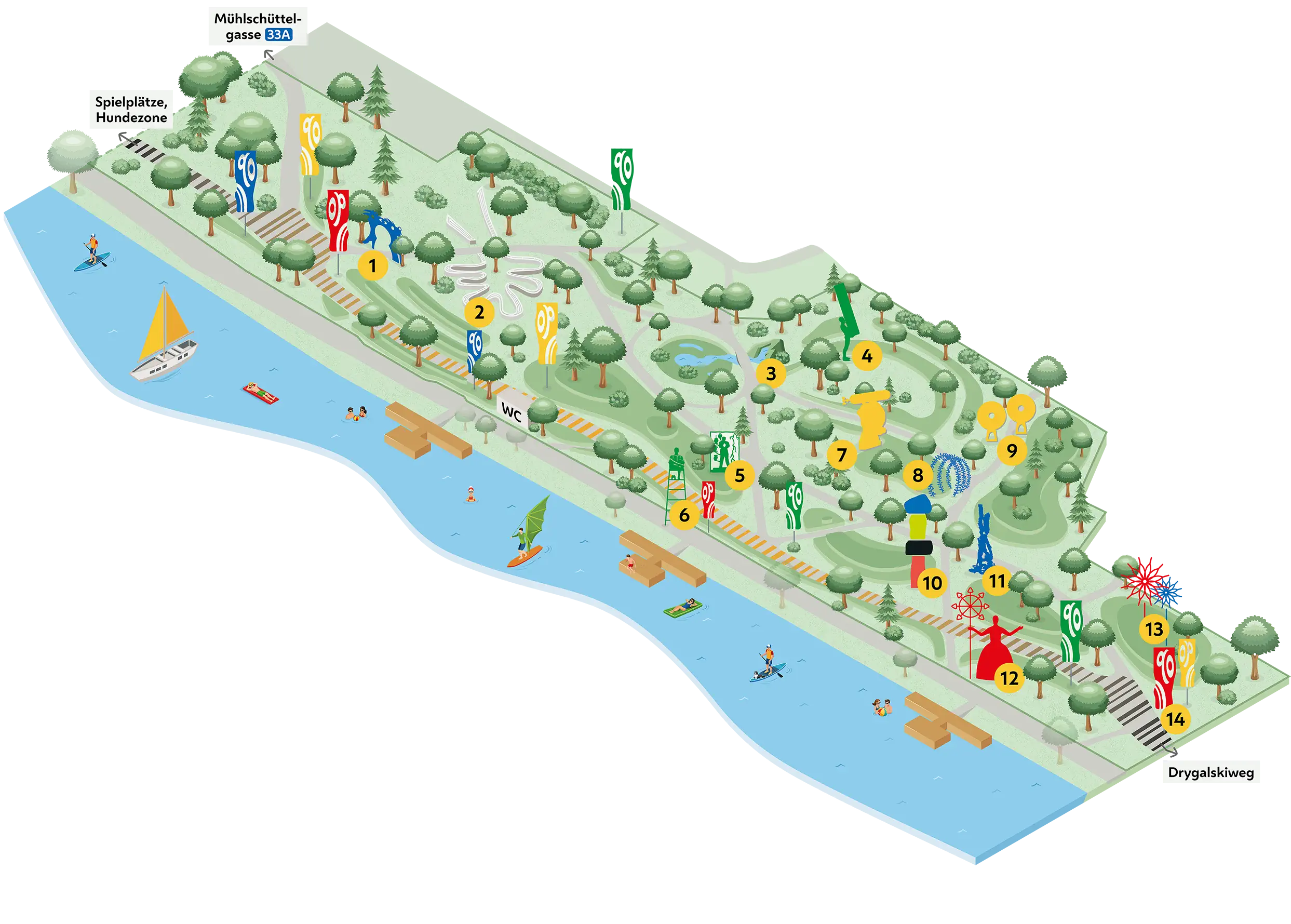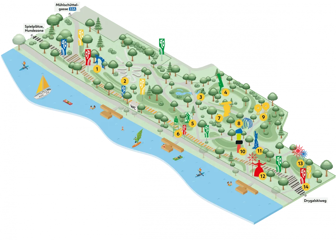 3000 Quadratmeter neuer Park entstanden hier, wo sich vorher eine Uferstraße und Privatgärten befanden, 150 neue Bäume wurden gepflanzt. Vierzehn Kunstwerke verteilte Heller über dem Areal, eines davon aus eigener Produktion: eine wasserdampfsprühende blecherne Frauenfigur, die das Mühlschüttelufer zum „Gestade“ hochjazzt. Wie die meisten anderen Skulpturen ist sie der Abteilung plakative Fantasyskulptur mit Traumsymbolik zuzurechnen, deren Symbolik sich bereits mit einer homöopathischen Dosis Fantasie entschlüsseln lässt. Auch solche Kunst hat ihre Berechtigung, allerdings wurde sie von der magistratseigenen Parkgestaltung so hanebüchen umgärtnert, dass sie die Poesie niederösterreichischer Kreisverkehrsinseln ausstrahlt.