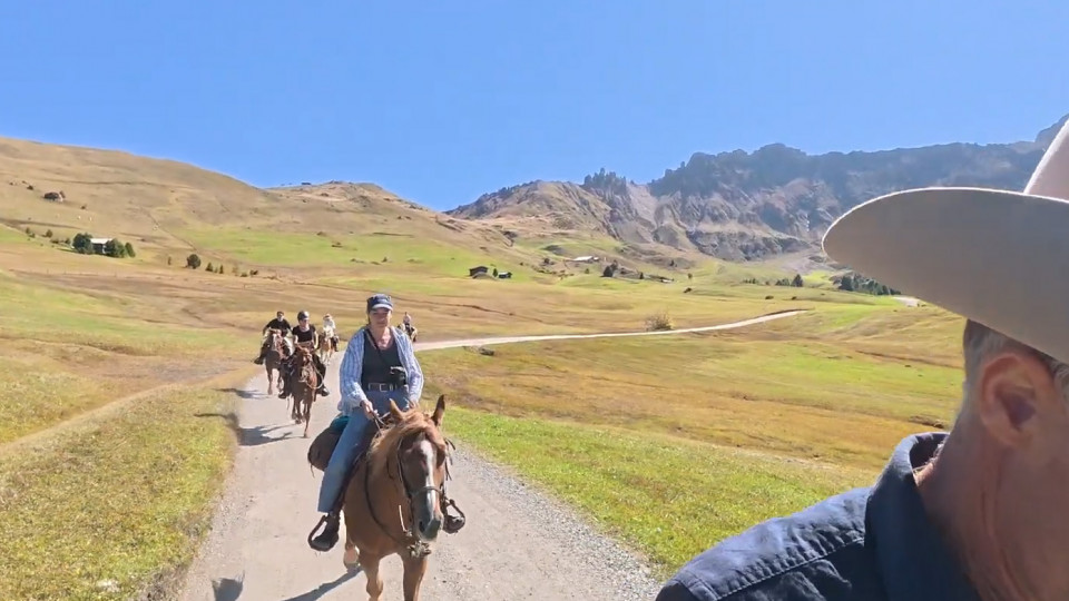 Pfotemoderator Stefan trifft auf der Koppel des Gunserhofes in Kastelruth Wanderreitführer Thomas und seine Pferde.