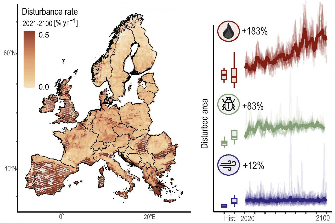 Essendo però uno studio di revisione della letteratura scientifica, mancava di una stima concreta dell’impatto dei disturbi naturali sullo sterminato patrimonio boschivo d’Europa che equivale a 185 milioni di ettari. Ora abbiamo la conferma: il cambiamento climatico porterà a un aumento significativo della mortalità nei boschi europei, a causa dell’intensificarsi dei disturbi naturali. Lo studio offre anche un’identificazione degli hotspot, ovvero dove sarà più probabile che accadano incendi, dove infestazioni di insetti e dove – anche se con maggior margine di incertezza – le tempeste.