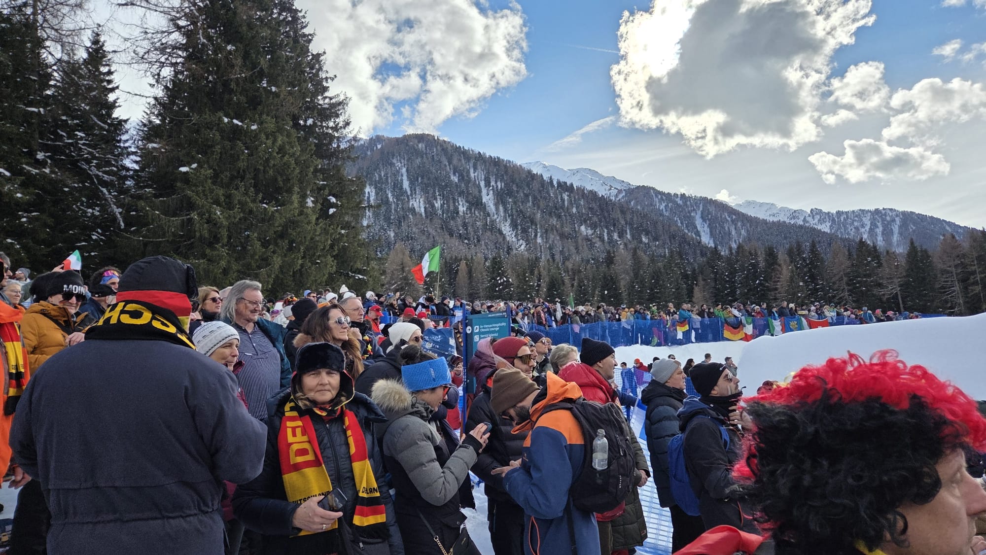 • A me tocca il compito di assistere alla gara nella zona C quella dei “biglietti in piedi” da 50 euro. Questo è uno dei veri “plus” della giornata. Assistere a delle gare olimpiche per quella cifra non è per nulla male. E il pubblico che si trova è di veri appassionati. Si vedono delle splendide parrucche germaniche a forma di fiamma, i francesi intonano Allez les Bleues“, il clima è di festa, ma senza eccessi. Casualmente mi posiziono in un settore di tifosi italiani. Sanno tutto di biathlon. Conoscono anche gli atleti stranieri che sfrecciano e incitano tutti urlando il nome di battesimo.  Bellissimo. Sono così appassionati che azzeccano tutte le previsioni. Quando parte Vittozzi per l’ultima frazione gli azzurri sono quarti. ”Lei al tiro sbaglia pochissimo. La Francia non la prendiamo, ma secondo me arriviamo secondi“, dice il vicino, evidentemente non scaramantico. Nell’ultima serie Vittozzi in effetti non sbaglia un colpo, le tedesche e le norvegesi sì. L’ultimo giro l’atleta cadorina  lo fa in trionfo, salutando il pubblico. Quando scollina dopo l’ultima salita si apre in un sorriso. Il boato ”Vai Lisaaaa“ dura fino a quando taglierà in traguardo. Un argento memorabile. Tutti felici per Dorothea Wierer, all’ultima Olimpiade.