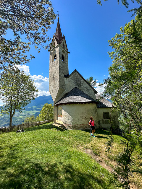 Das Kirchlein St. Johann in Karnol erhebt sich neben dem malerischen Holderer-Hof auf einem Hügel. Die Kirche ist uralt, sie wird bereits im 12. Jh. erwähnt. Die Vermutung liegt nahe, dass es sich um einen alten Kultplatz handelt. Auf das hohe Alter lässt auch die halbrunde Apsis schließen, das Türmchen wurde erst viel später aufgesetzt. Die Fresken im Inneren sind aus dem 15. und 16. Jh. Dramatisch die Darstellung der Hl. Ursula, die laut Legende auf der Rückfahrt von einer Pilgerreise bei Köln am Rhein mit der Gefolgschaft von 11.000 (!!) Jungfrauen mit Pfeilen das Martyrium erlitt.